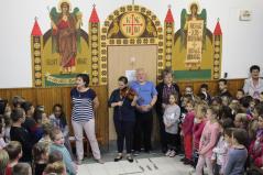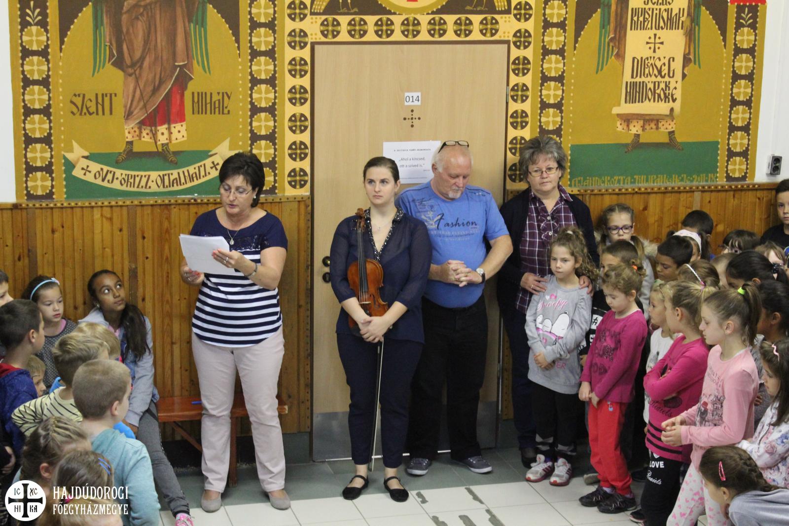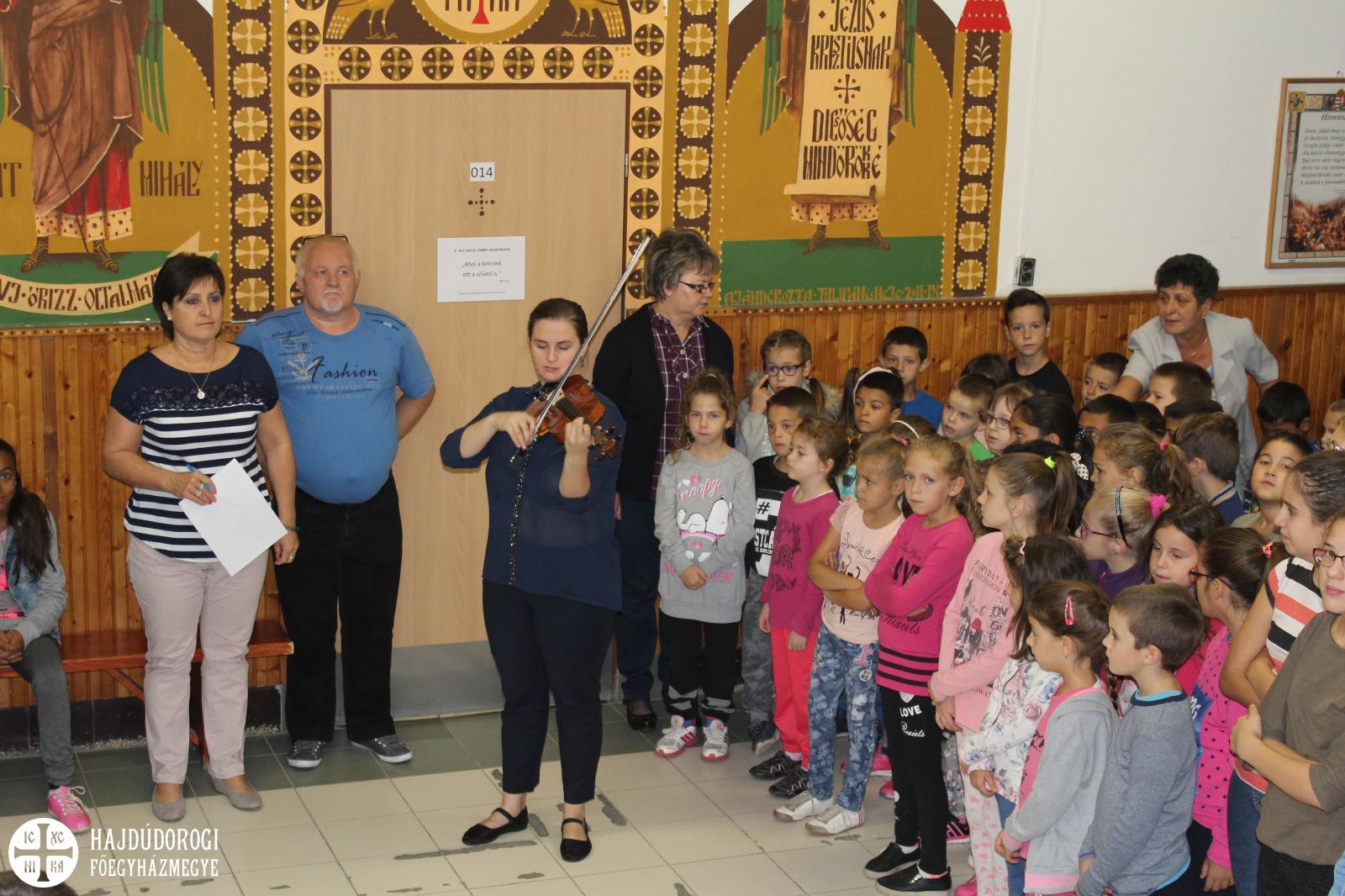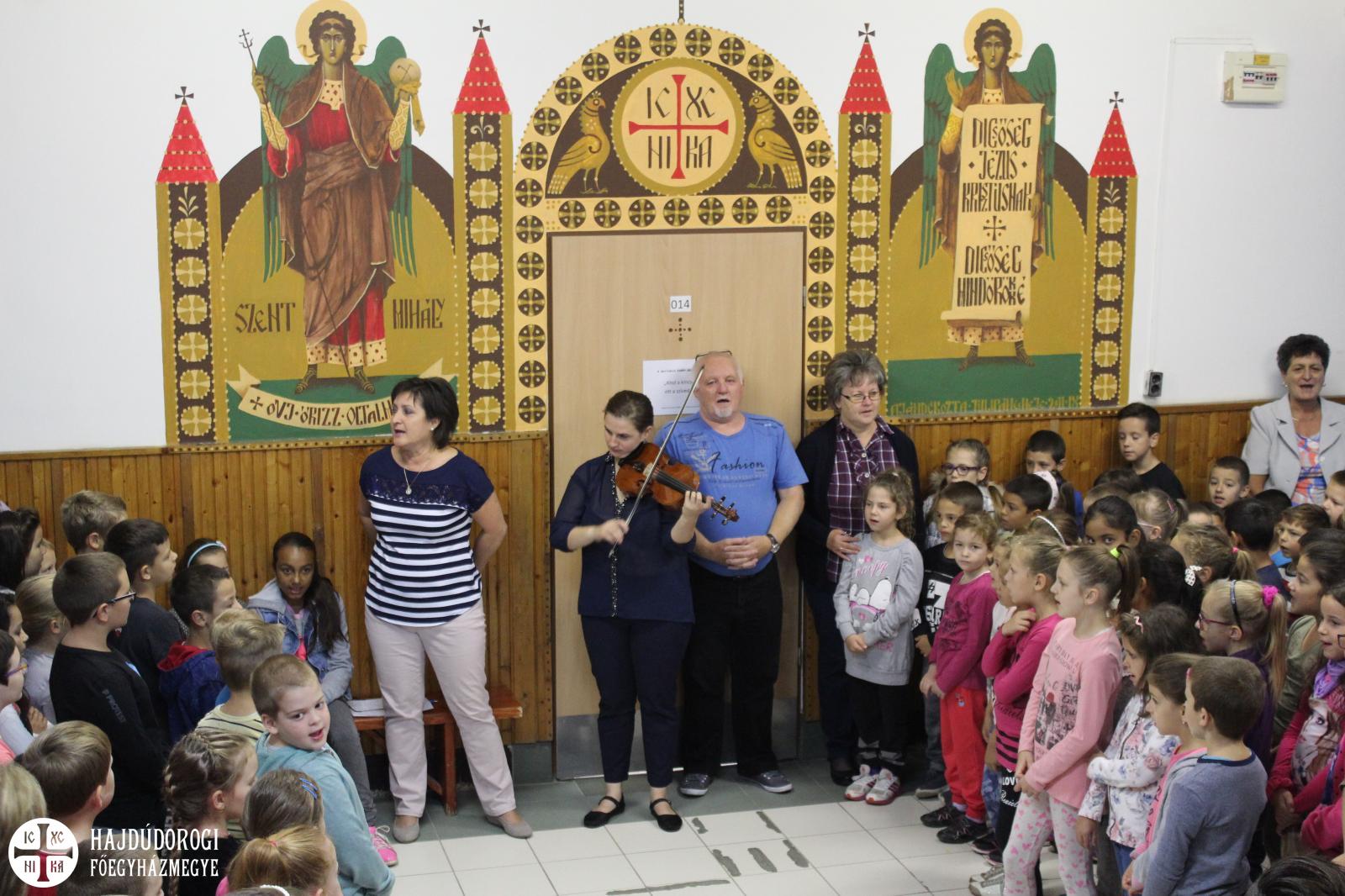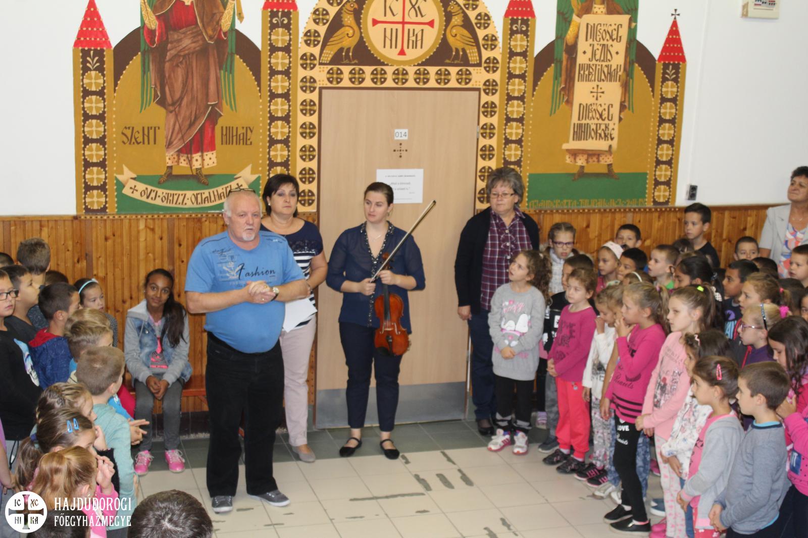 Örömzenéléssel kezdődött szeptember 17-e a Szent Mihály Görögkatolikus Óvoda és Általános iskola diákjai és pedagógusai számára. A Magyar Népdal Napja alkalmából – melyet 2014-ben rendeztek meg először Martonvásáron - Csóbán Renáta személyében, egy fiatal népzenész játszott hegedűjén az iskola aulájában. Vidám hangulatot teremtett gyerekeknek, felnőtteknek egyaránt ezen a kissé hűvös, borongós reggelen. Ezt követően Topor István, a humán munkaközösség vezetője köszöntötte az intézmény tanulóit és dolgozóit. Majd Kovácsné Frank Magdolna igazgató helyettes osztott meg néhány gondolatot a magyar népzene fontosságáról, a hagyományőrzésről és arról, hogy miért is kezdeményezték e nap megünneplését. Ezután közös éneklésre hívták a pedagógusokat, diákokat, majd fiatal népzenészünk az óvodásokat is megörvendeztette muzsikájával. Rövid hegedűjátéka után a legapróbbakat is megénekeltette, számukra ismert dalocskákat elővarázsolva gyönyörű hangszeréből.