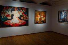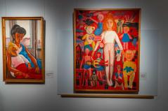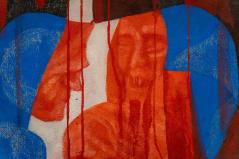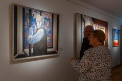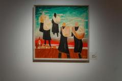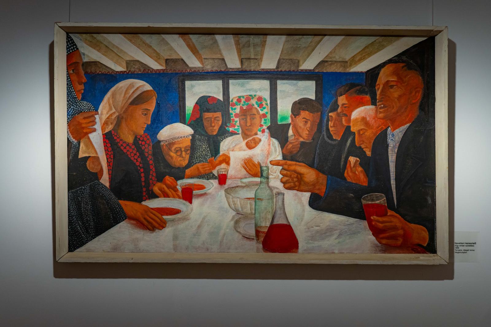 Egy másik képen táncoló párt és visszafogottan ünneplő társaságot látunk. A magyar nemzeti színekkel megalkotott mű a maga szigorúságával a korabeli rendszert illeti kritikával: nem tudunk parancsra nevetni.