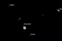 Csillagászati távcsővel nagy nagyításon egy látómezőben lesz látható a két bolygó és holdjai