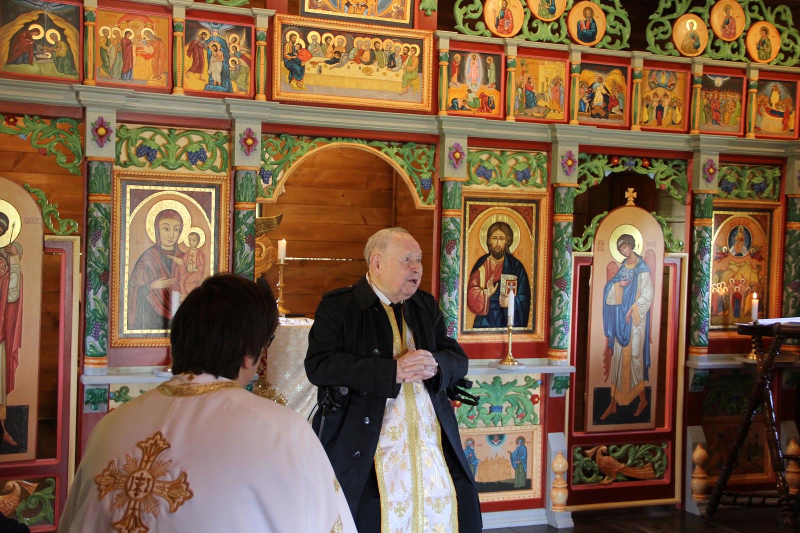 A Szent Liturgiában a település két legidősebb görögkatolikus papja is szolgált: Ihnáth János atya vezette a szertartást, Erdélyi József atya pedig 93 éves korát meghazudtoló lelkesedéssel beszélt a prédikációban arról, hogy 2000 év óta él a kereszténység, és ez csakis úgy lehetséges, ha ma is ugyanazzal az örömmel tesszük a dolgunkat, mint amilyennel a mennybemenetel után a tanítványok hirdették az Evangéliumot. Ugyanis ezt maga Jézus Krisztus adja: „…örömöt szereztél tanítványaidnak…” (tropárból)