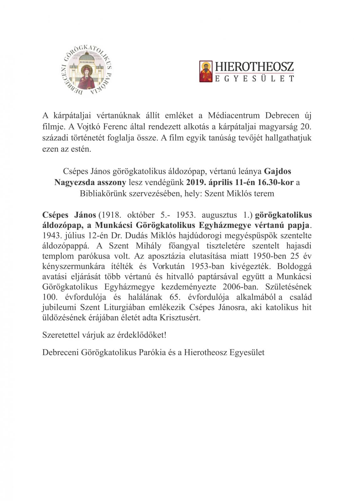 A debreceni parókia a csütörtöki Bibliakörön látja vendégül Csépes János görögkatolikus áldozópap, vértanú leányát Gajdos Nagyezsda asszonyt
