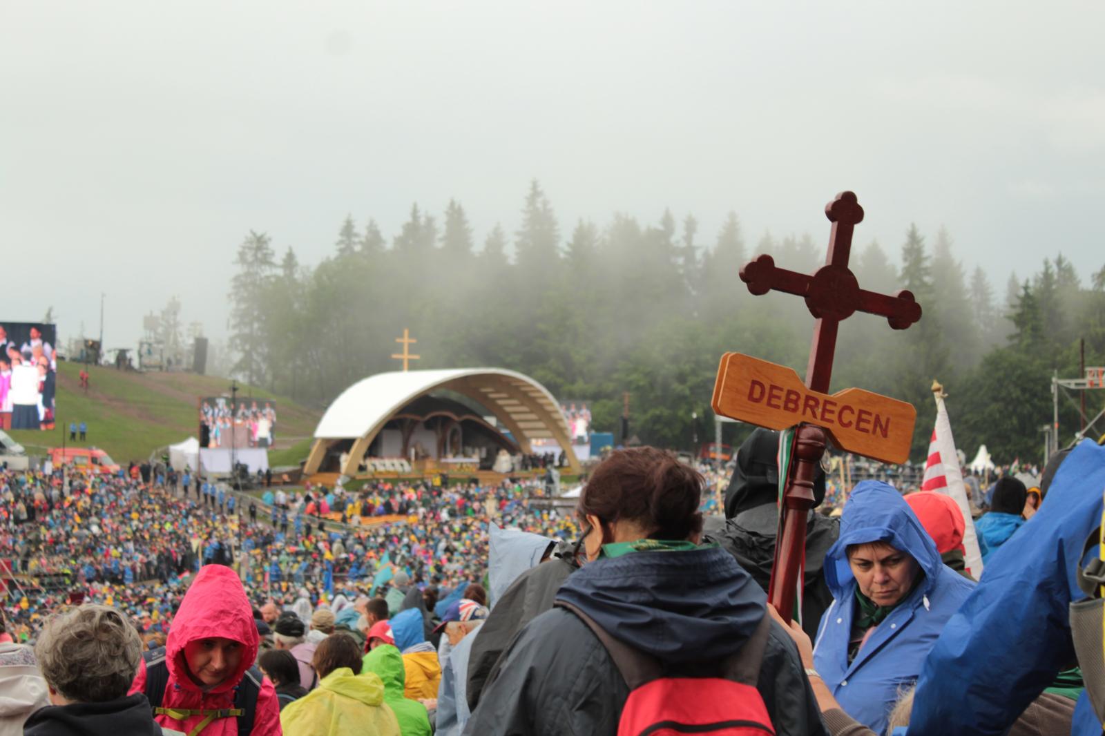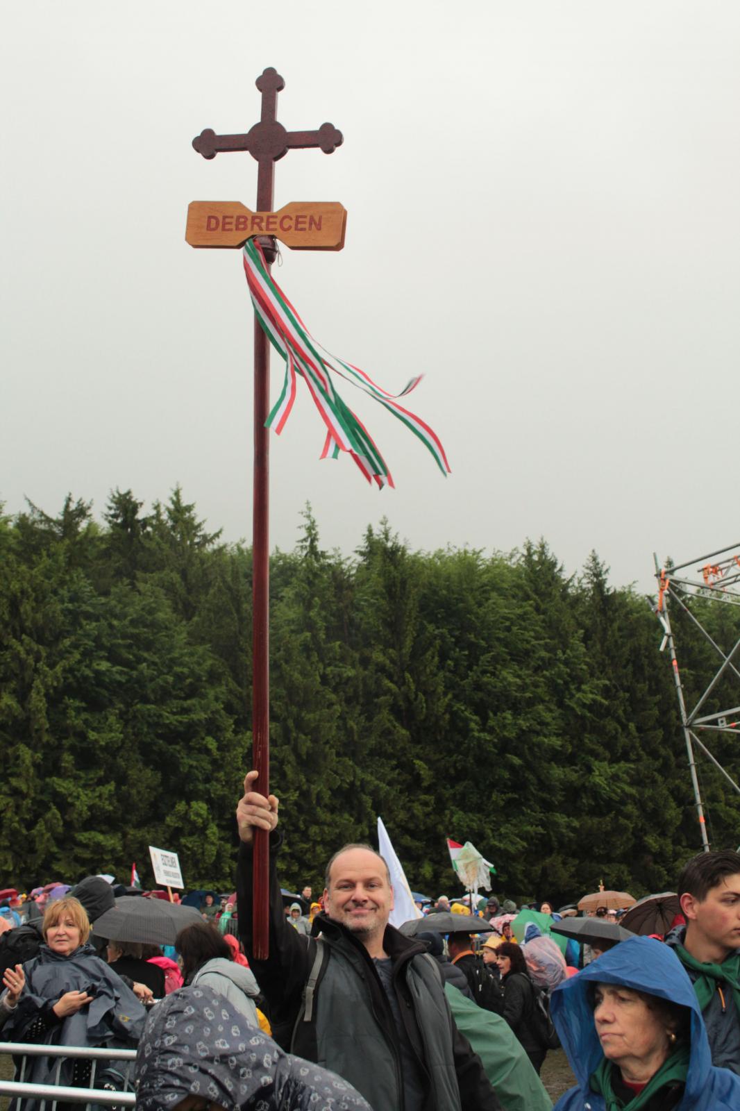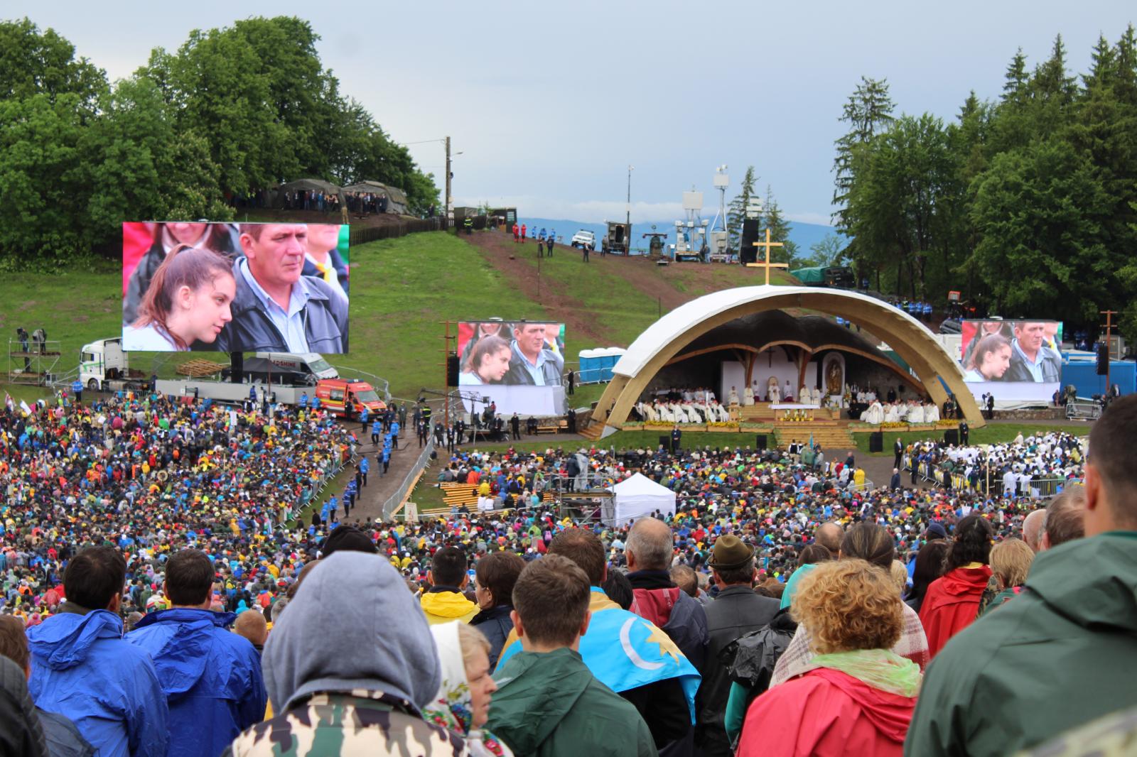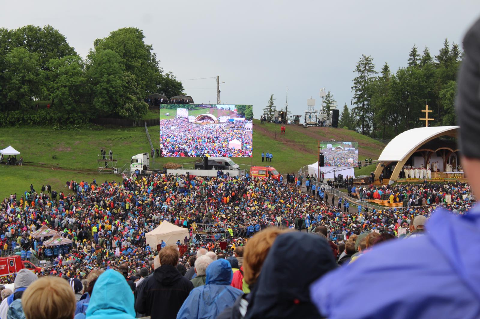 Szombaton reggel nagy esőben vágtunk neki kirándulásunk legjobban várt eseményének; útközben sokat énekeltünk, és imáink meghallgatásra találtak, ugyanis Krisztus földi helytartójának érkezésére elállt az eső. Szemtanúi lehettünk annak, hogy Ferenc pápa először celebrál misét a magyarok szent zarándokhelyén és aranyrózsát helyez el a Szűzanya kegyszobrához.