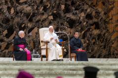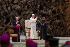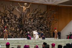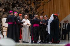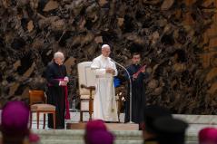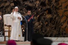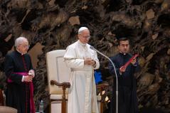 Az Egyház fáradhatatlanul fogja ismételni: Le a fegyverekkel! És szeretnék hálát adni Istennek azokért, akik csendben, imádságban, felajánlással a békét szövögetik; és a keresztényekért – keleti és latin keresztényekért –, akik, különösen a Közel-Keleten, kitartanak földjeiken, akik erősebbek, mint annak kísértése, hogy elhagyják otthonukat. A keresztényeknek meg kell adni a lehetőséget, nem csak szavakban, hogy földjeiken maradhassanak a biztonságos léthez szükséges összes jogokkal. Kérlek benneteket, dolgozzatok ezen!