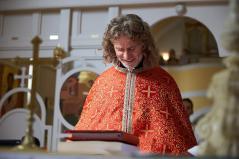 A Szent Liturgia végén egyházközségünk világi elnöke, Kovaliczky János köszöntötte a jubiláns papot, aki a parókiánk nevében egy – külön erre az alkalomra készített – áldó keresztet ajándékozott, melybe László atya ezüstmisés jelmondata lett gravírozva: „Dicsőség Neked Isten, dicsőség!”