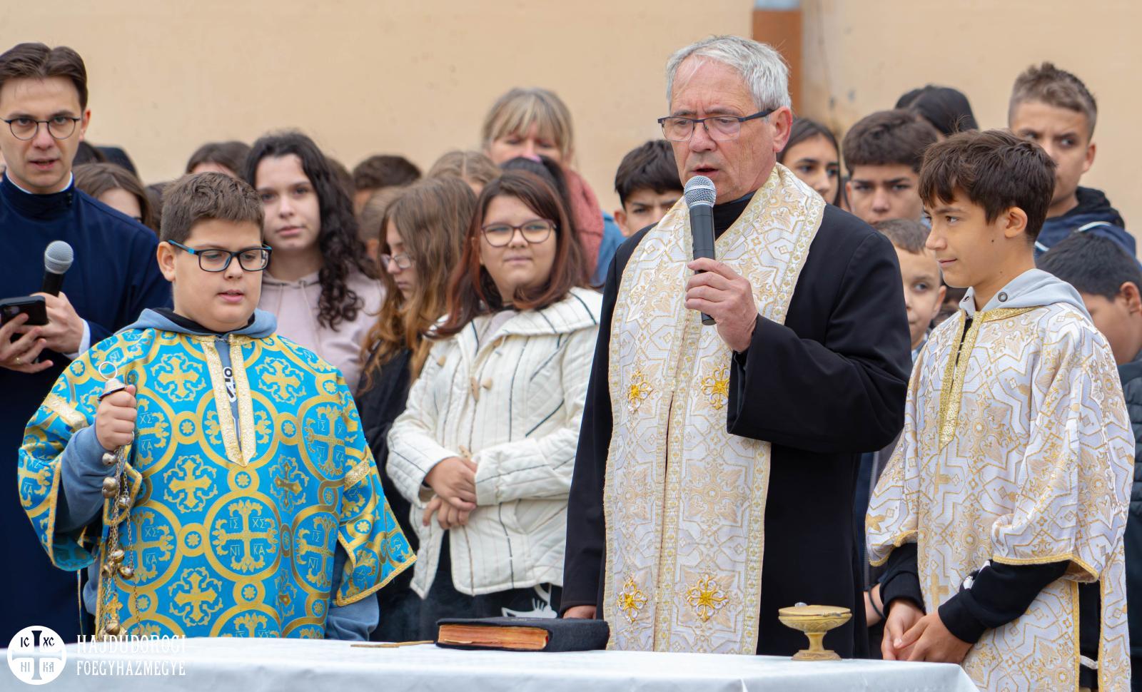 „15 éve nevelünk, tanítunk és formálunk egyházi szellemben itt Nyíracsádon. 15 éve építünk közösséget, ahol a hit, a tudás és a barátság, valamint az álmok szárba szökkennek. 15 év telt el - most már nem vagyunk kisgyerekek. Kamasz iskola lettünk, tele energiával, tervekkel és hittel a jövőben. Boldog születésnapot, Szent Piroska Általános Iskola!” – kezdte köszöntőjét Garda László intézményvezető.