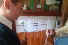 Parókus atya prédikációja elején nagyon sok szeretettel köszöntötte az elsőáldozó gyerekeket. Beszélt a virág és a gyertya szimbólumáról, a tisztaságról, melyet ezek jelképeznek, hiszen a fiatalok előzőleg részesültek első alkalommal a bűnbánat szentségében. Teljesen tisztán és ártatlanul jelentek tehát most meg, követve a fényt, mely Krisztus, a világ Világossága, aki ezt a fényt a szívünkbe teszi, aki értünk áldozta fel magát a kereszten, ahogy a szentelt gyertya is elég az oltárra helyezve.