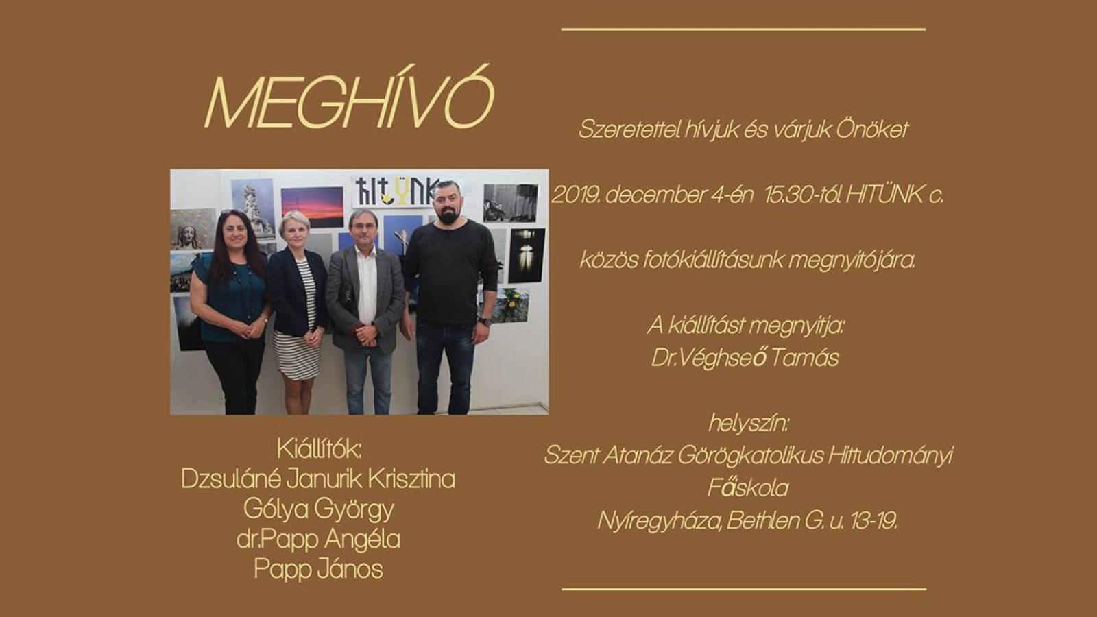 A görögkatolikus hittudományi főiskolán december 4-én fotókiállítás nyílik három nyíradonyi és egy nyíregyházi alkotó műveiből. Megnyitó gondolatokat mond a főiskola rektora, dr. Véghseő Tamás atya.
