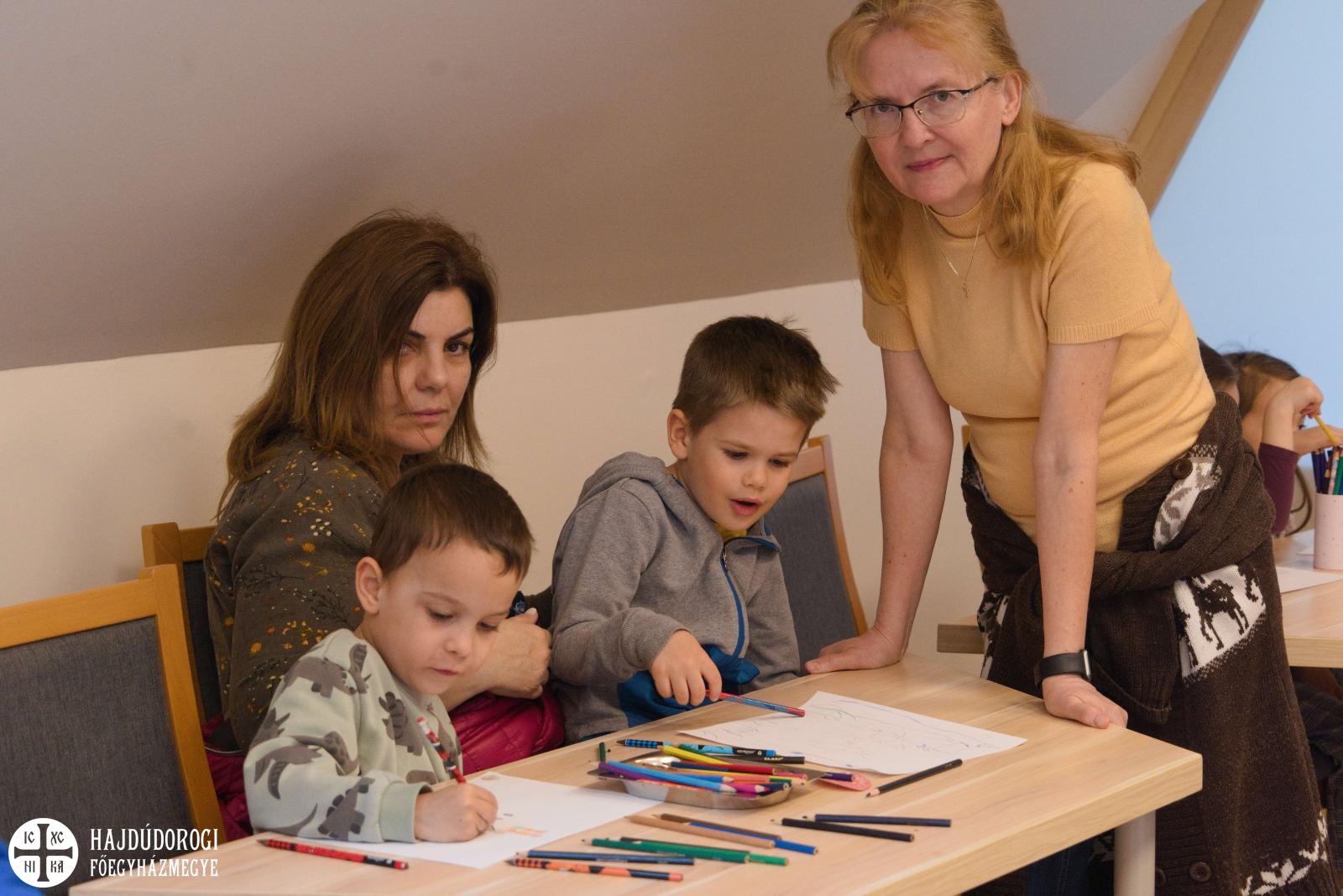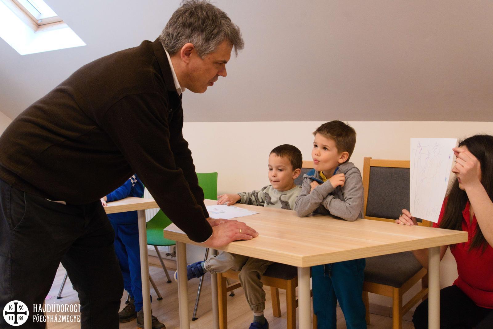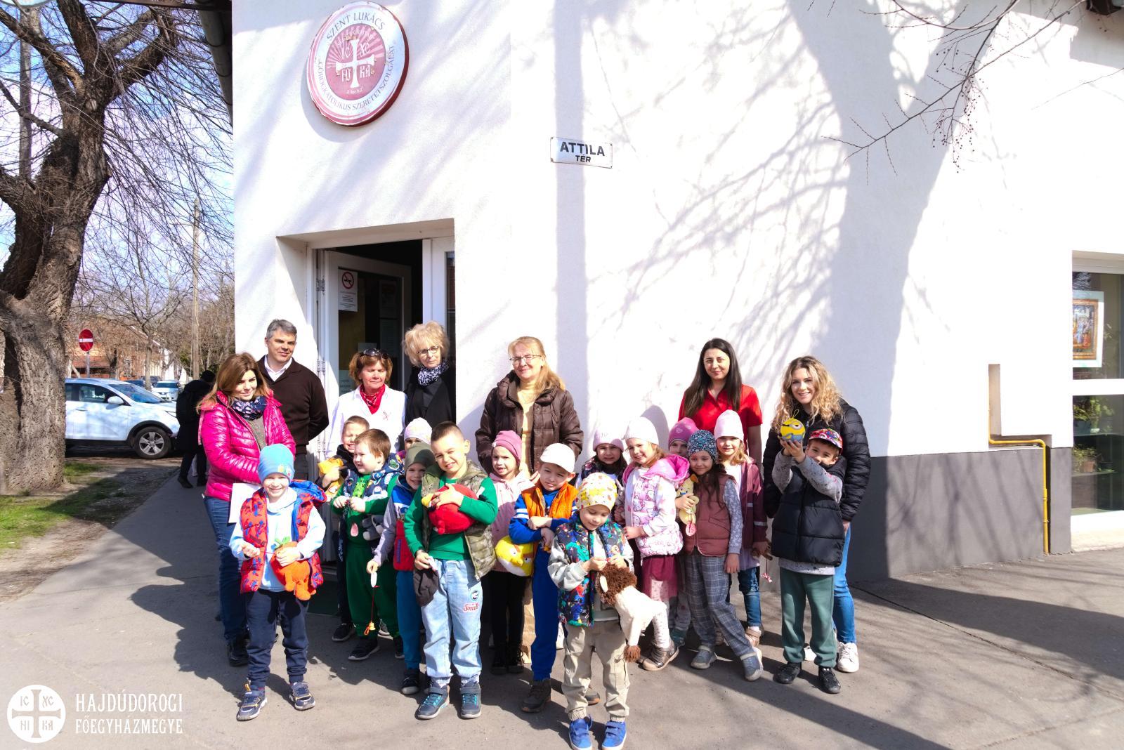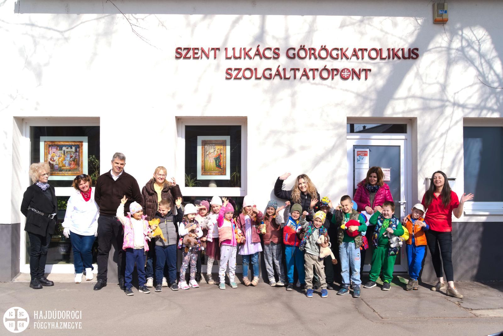 Délelőtt Vígkedvű Mihály utcai görögkatolikus óvodánkból érkezett két csoport, összesen harminc gyermek a szolgáltatópontra. Az ovisokat Jaczkó Dániel, a főegyházmegyei karitász vezetője köszöntötte, röviden összefoglalva a szolgáltatópont munkáját. Elmondta, hogy ezen a helyen ruhaneművel és lábbelivel is tudnak segíteni a rászorulóknak és gyerekeiknek.