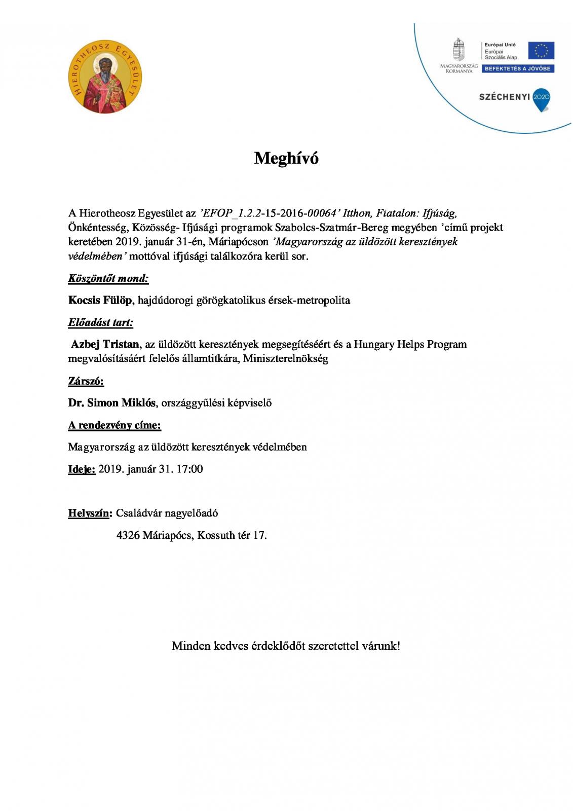 "Magyarország az üldözött keresztények védelmében" mottóval ifjúsági találkozót szervez a Hierotheosz Egyesület 2019. január 31-én, Máriapócson.