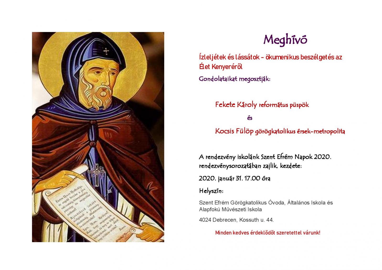 Különleges beszélgetésre kerül sor a Szent Efrém napok keretében: január 31-én az Eucharisztiáról értekezik nyilvánosan Kocsis Fülöp érsek-metropolita atya és dr. Fekete Károly református püspök, "Ízleljétek és lássátok! - ökumenikus beszélgetés az Élet Kenyeréről" címmel.