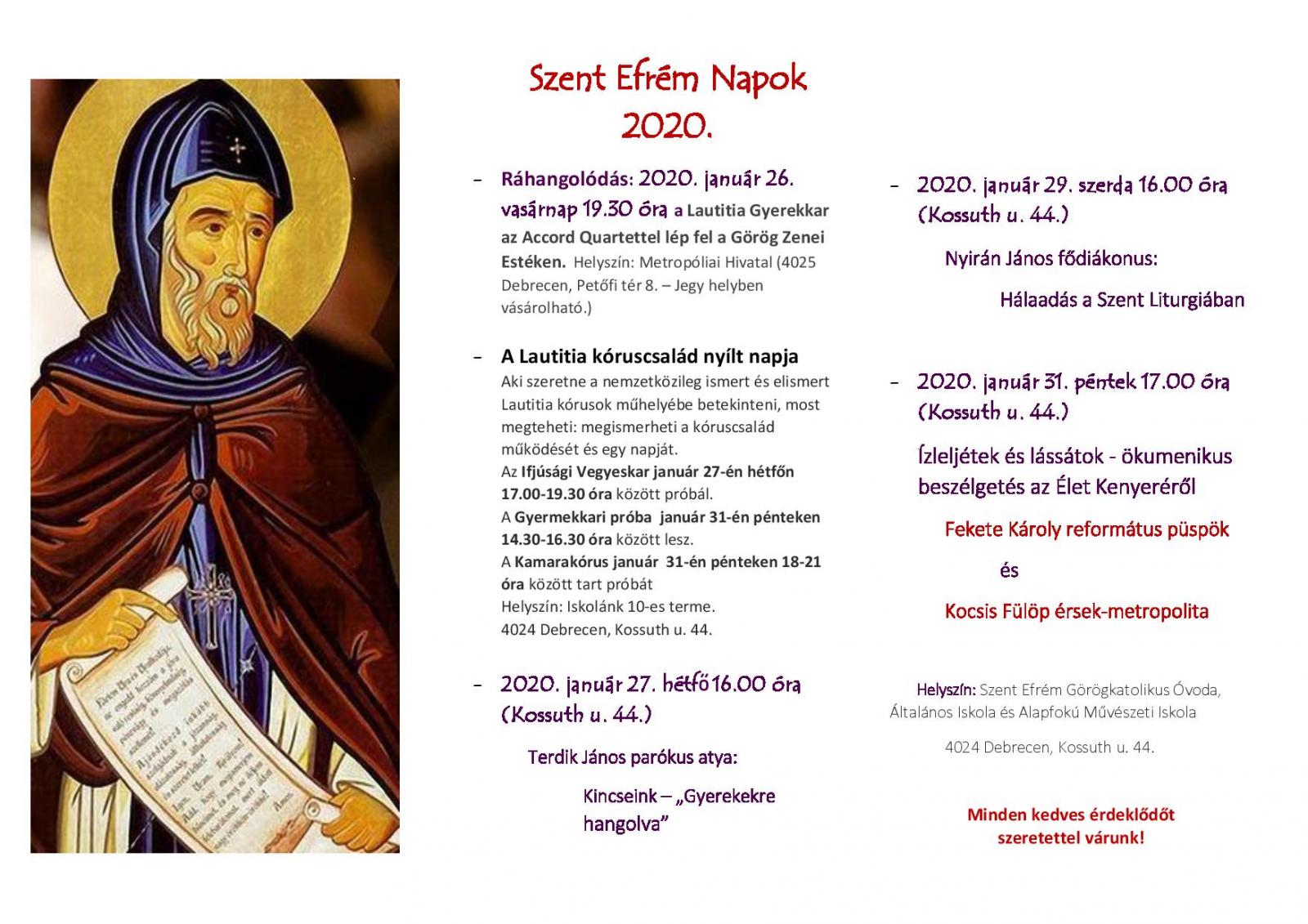 Ezzel párhuzamosan hívjuk fel a kedves testvérek figyelmét a Szent Efrém napokra is, amelyet ezen a héten rendeznek az intézményben. Koncertekre, a Lautitia Kóruscsalád nyílt napjára és hitéletünket erősítő előadásokra is várják az érdeklődőket.