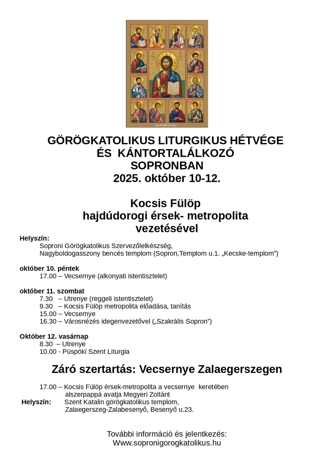 A találkozót, az előadásokat és beszélgetéseket, valamint a záró vecsernyét Fülöp metropolita fogja vezetni. Ezutóbbi keretében Megyeri Zoltánt alszerpappá avatja a metropolita Zalaegerszeg-Zalabesenyőn a Szent Katalin görögkatolikus templomban.