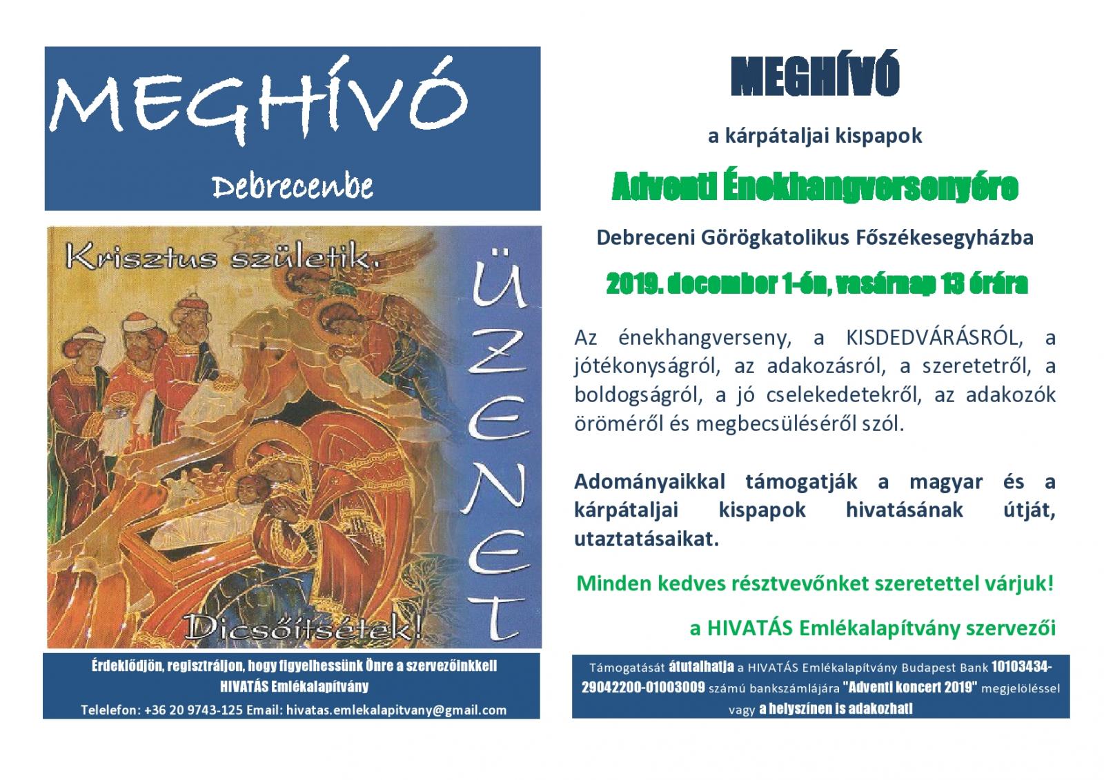 A Hivatás Emlékalapítvány tavaly hagyományteremtő szándékkal szervezett a várakozás időszakában hangversenyt Máriapócson. A kárpátaljai kispapok kórusa idén már nem csak a bazilikában, hanem a debreceni Attila téri Főszékesegyházban is megörvendezteti a híveket, 2019. december 1-jén a déli liturgia után. Részletek a plakáton!