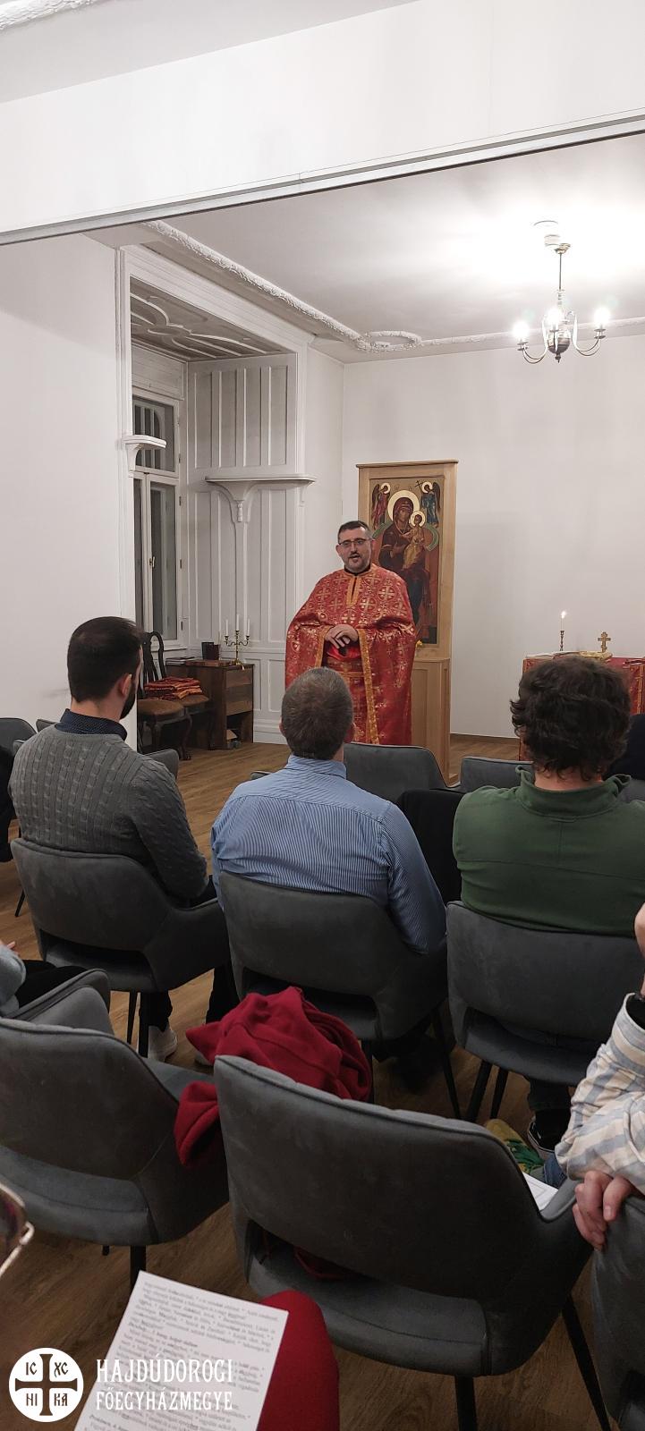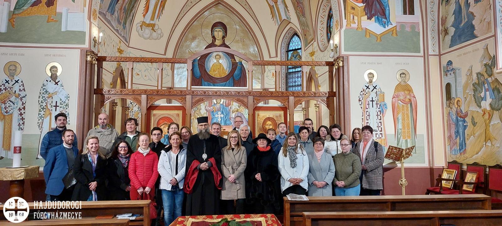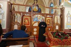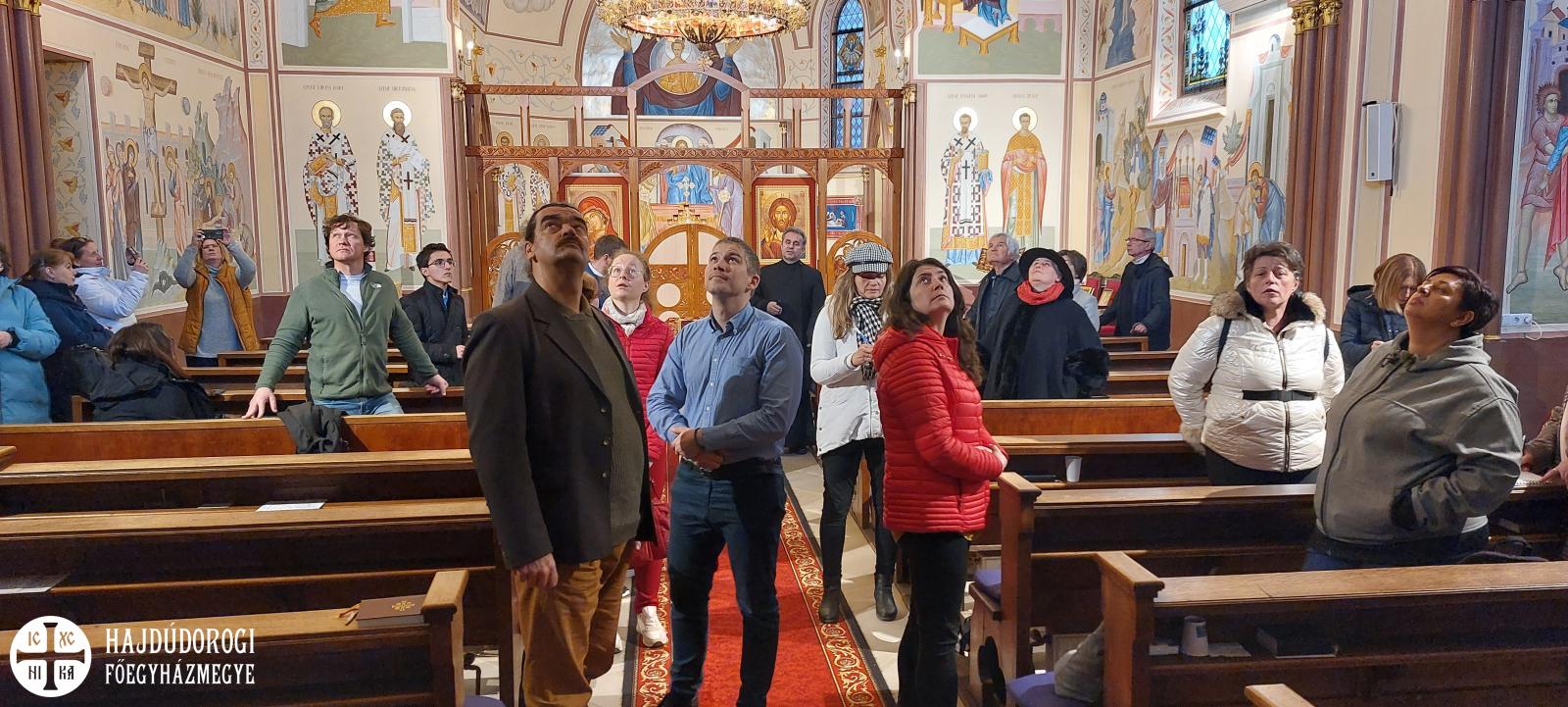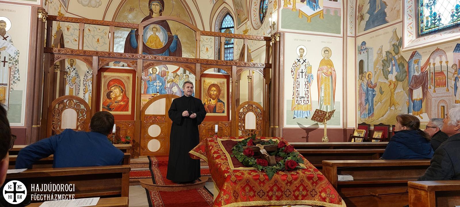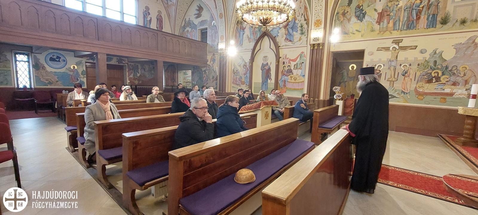 Dr. Papp Miklós atya tartott számukra templomi tárlatvezetést, lelki szemeik előtt elevenedett meg az ikonosztázion, majd közösen hangolódtak a lelki napra. Az ószövetségi és újszövetségi ikonpárokról mesélt a hitoktatóknak, illetve abban igyekezett ötletet adni számukra, hogyan tudják életükben kamatoztatni ezeket a tanításokat.