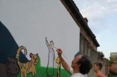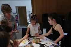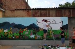 A táborba vendégalkotót is meghívtak, Komiszár János festőművészt, a Brassai művészeti díj kuratóriumának elnökét, aki így kezdte: „Egy kicsit megijedtem…Megint esett az eső az éjjel, és lelki szemeim előtt láttam, ahogy elmossa a falfestményünket a víz. De hál’ Istennek, nem esett baja. Sőt, azt kell mondjam: még jót is tett neki. Festőibb lett általa az alkotás. De mit is várunk? Pont egy özönvizet ábrázoló képet ne mosna el a nyári zivatar?” - Jogos. A művész úr több dologban is a gyerekek segítségére volt: újabb színekre igyekezett ráterelni őket, megmutatni a kontraszt jelentőségét, gyakorolni a kicsi-nagy közti különbséget, emellett az előtér-középtér-háttér lényegét is megpróbálták elsajátítani.