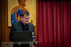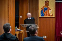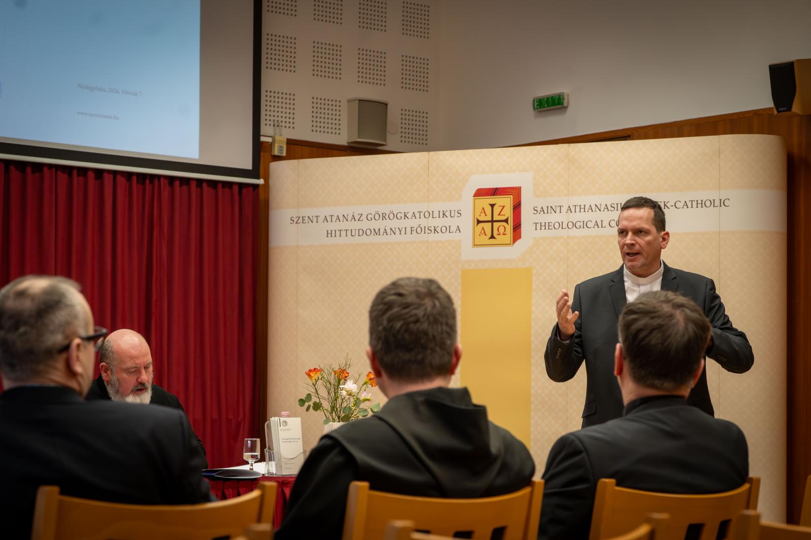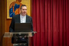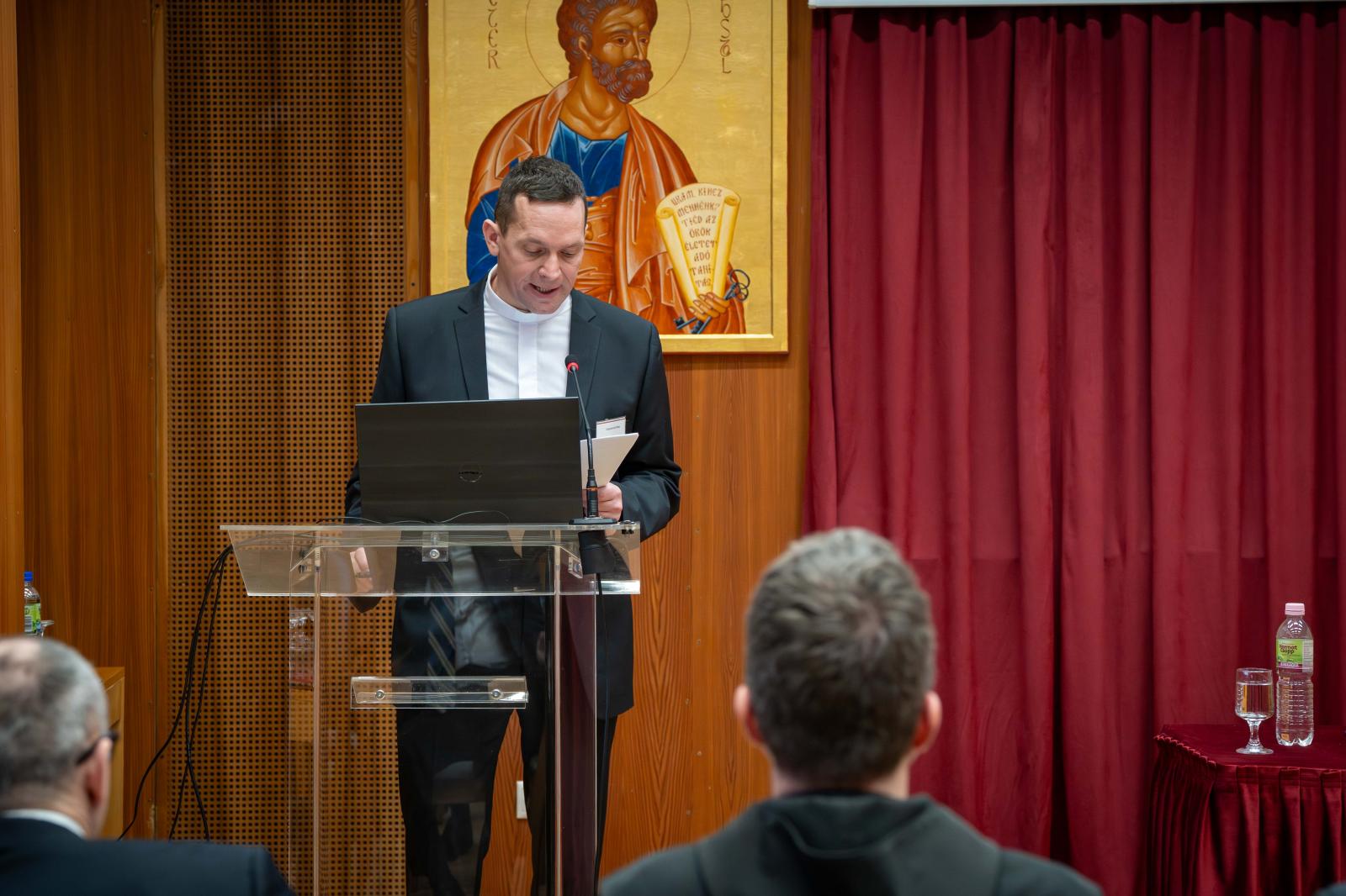 Ujházi Loránd, a Kánonjogi Posztgraduális Intézet tanszékvezető egyetemi tanára, a Nemzeti Közszolgálati Egyetem intézetvezetője, tudományos főmunkatársa előadásának címe A tábori püspökségtől a katonai ordinariátusig: hasonlóságok és eltérések volt.