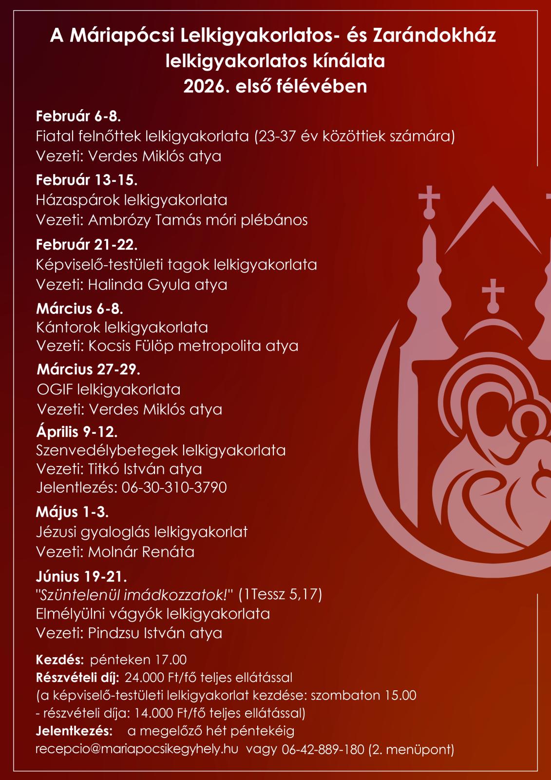 Itt pedig a Máriapócsi Lelkigyakorlatos- és Zarándokház első félévére tervezett lelkigyakorlatairól informálódhatnak.