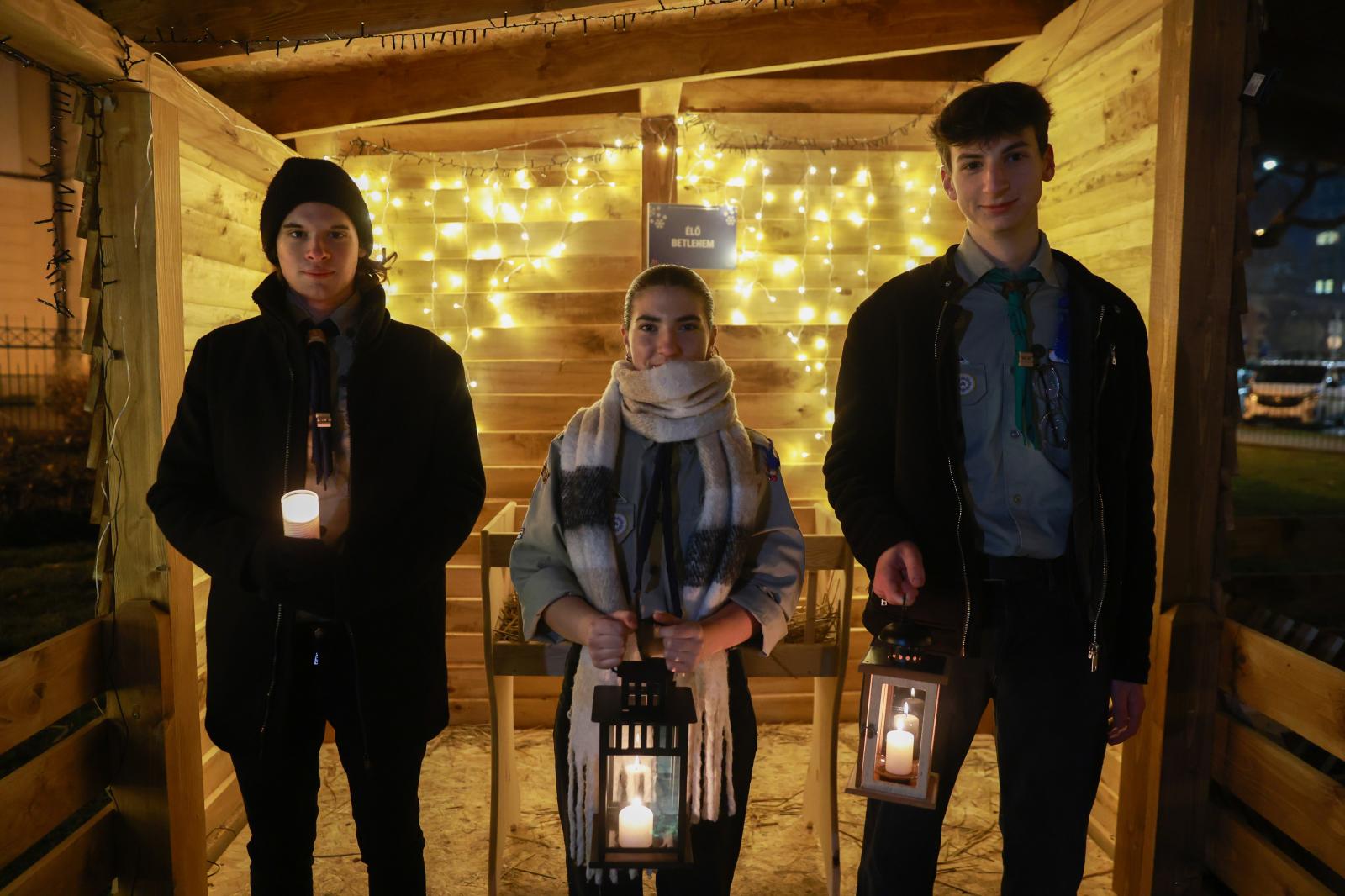A Szent József Katolikus Általános Iskola tanulói énekszóval köszöntötték december 16. délután az Emlékkertben azt a betlehemi lángot, amelyet már 2003 óta a 43. Főnix Cserkészcsapat cserkészei hoznak el Bécsből Debrecenbe, egy speciális mécsesben.