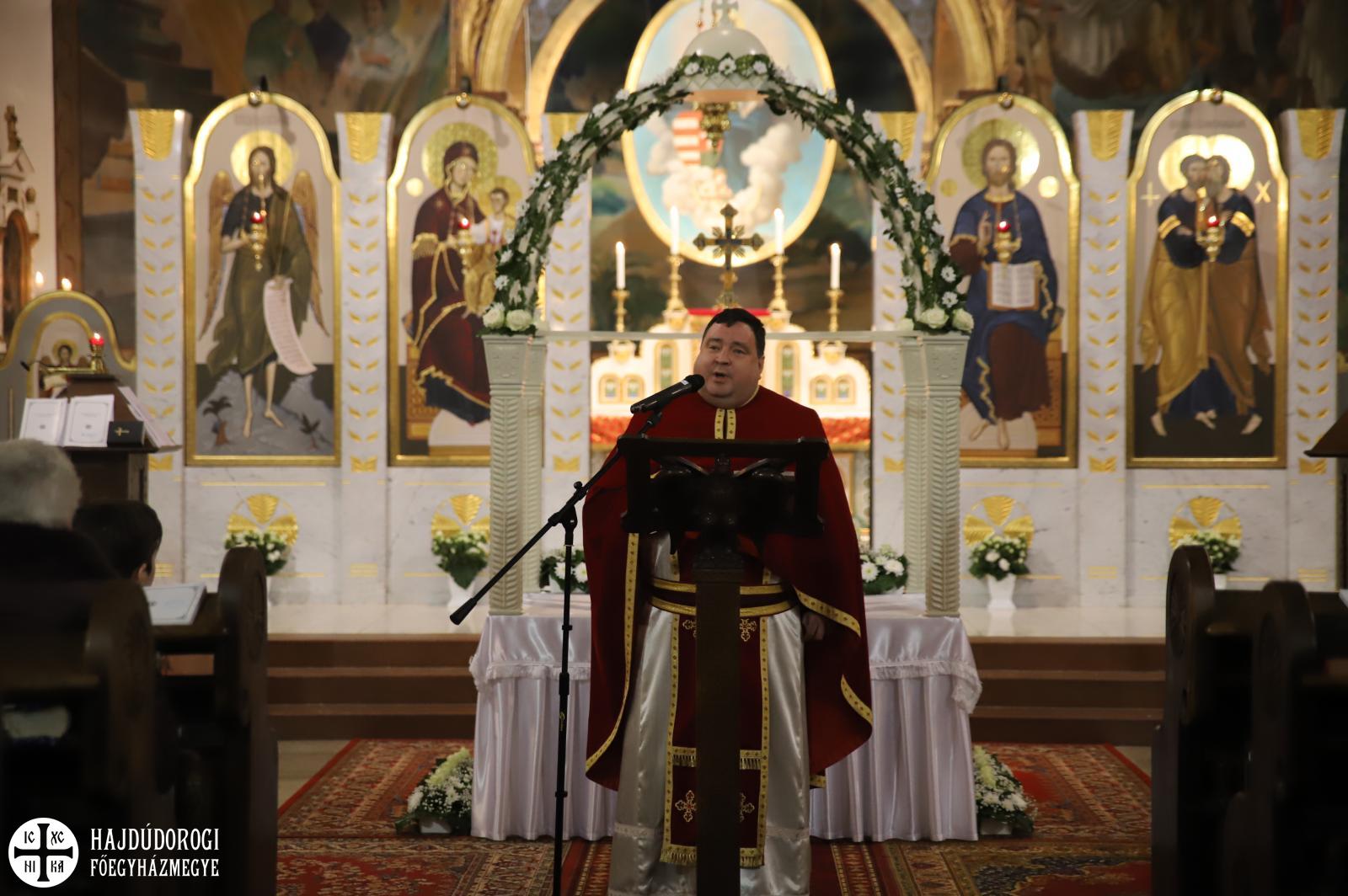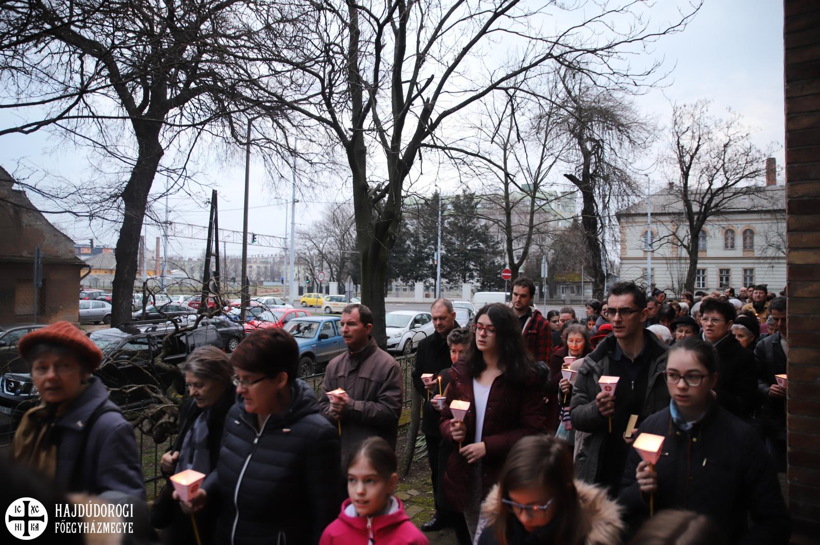 Krisztus passióját Szent Máté evangéliumából idézték fel, aminek kapcsán Lukács Imre atya, a főegyházmegye érseki hivatalának irodavezetője prédikált a híveknek. „Hogy nem látták Krisztus elítélői a nyilvánvalót?” – kezdte. Az emberi gonoszság olyan mély, hogy, nem pusztán egy fantasztikus embert, egy jótevőt, de magát az Istent állították ítélőszék elé elvetemültségükben. „Azt az Istent, aki a pusztában vizet fakasztott, aki az éhező népnek mannát adott(…)azt vágták pofon, aki a saját képére teremtette az embert”. Az egyház ezen a napon – folytatta Imre atya gondolatait – nem pusztán egy megemlékezésre, Jézus Krisztus sírjának megkoszorúzására hív minket, hanem arra, hogy váljunk valódi részévé a szent három nap eseményeinek, titkának.