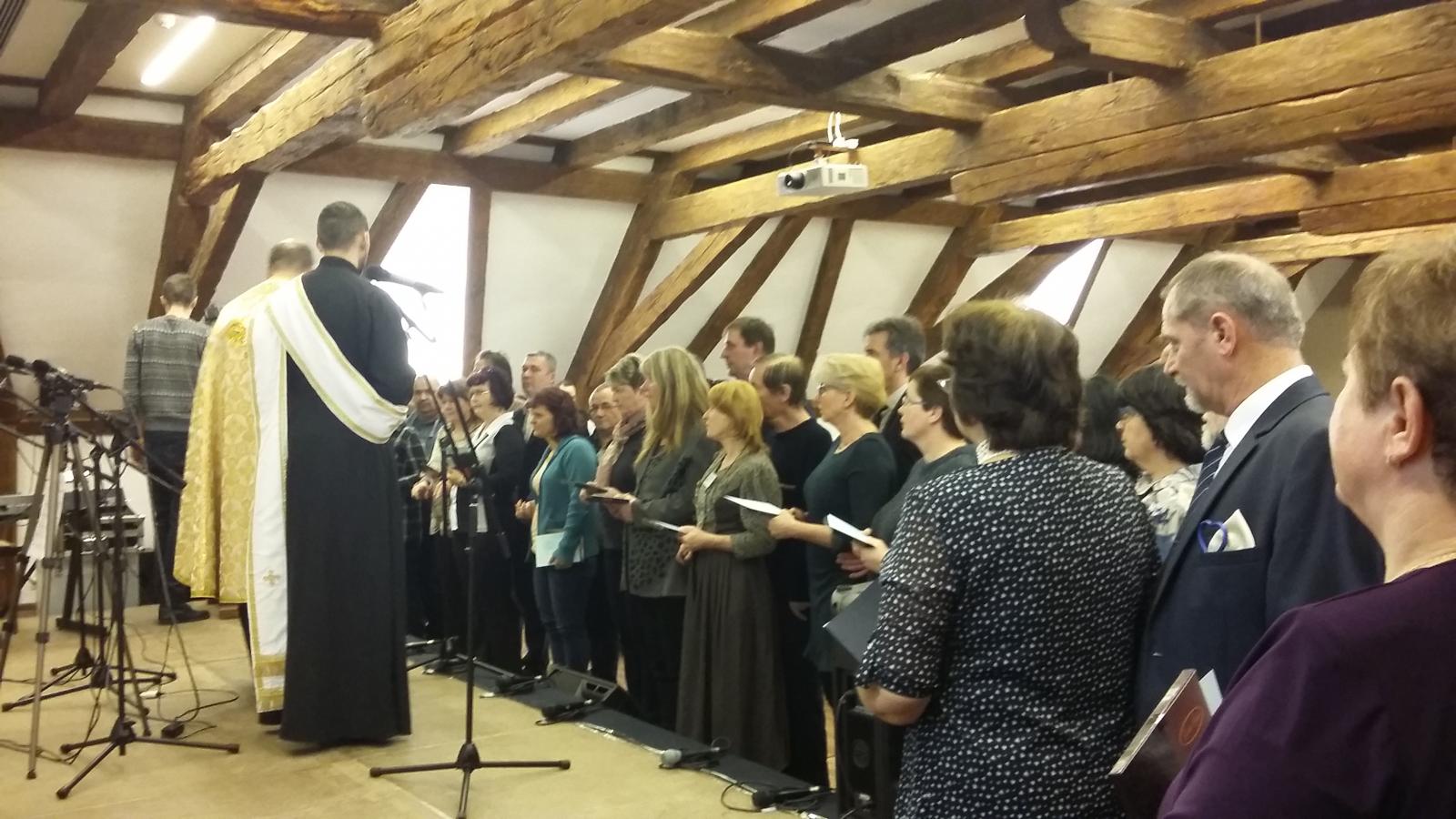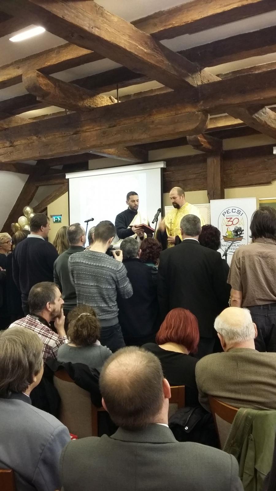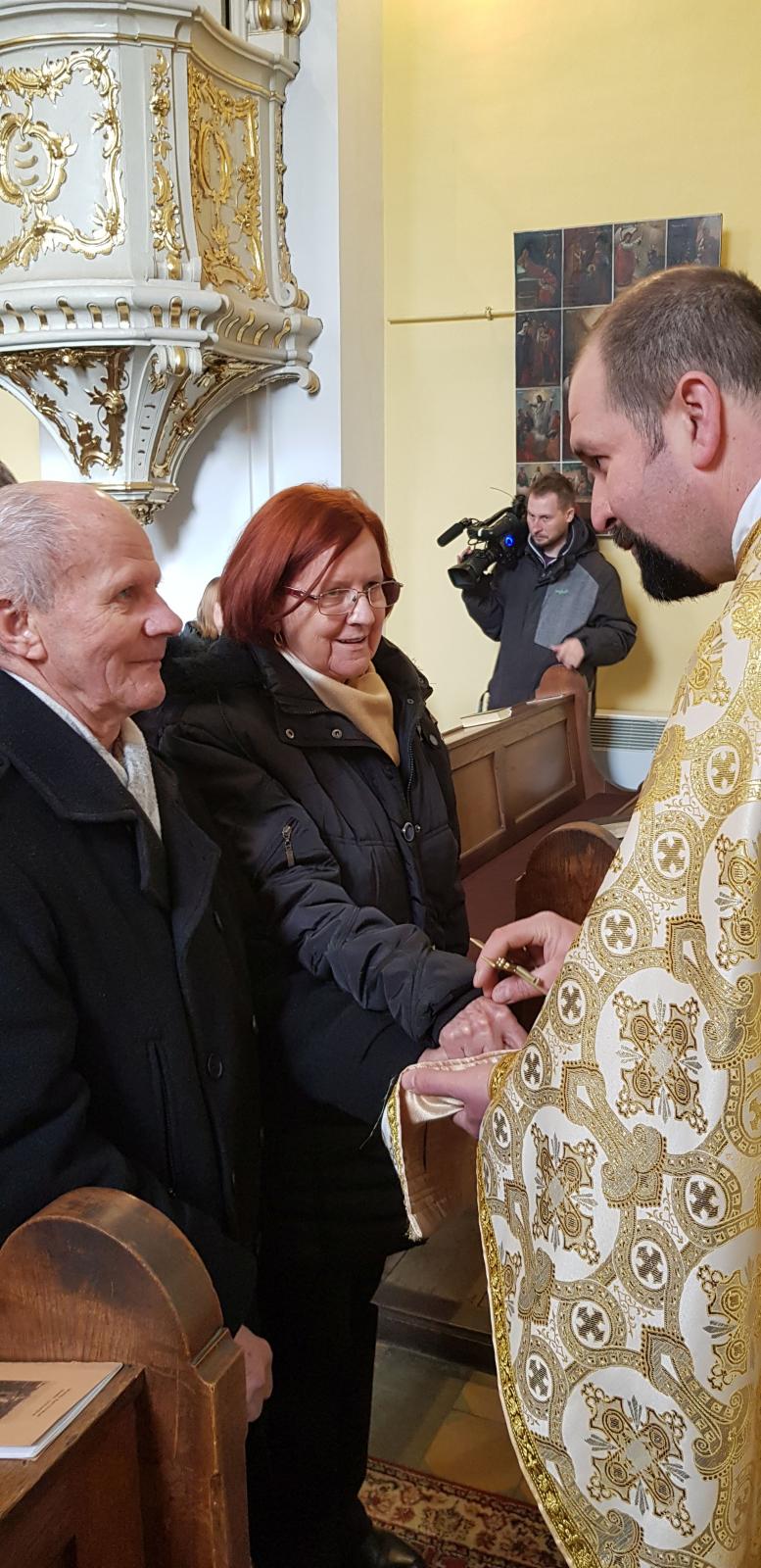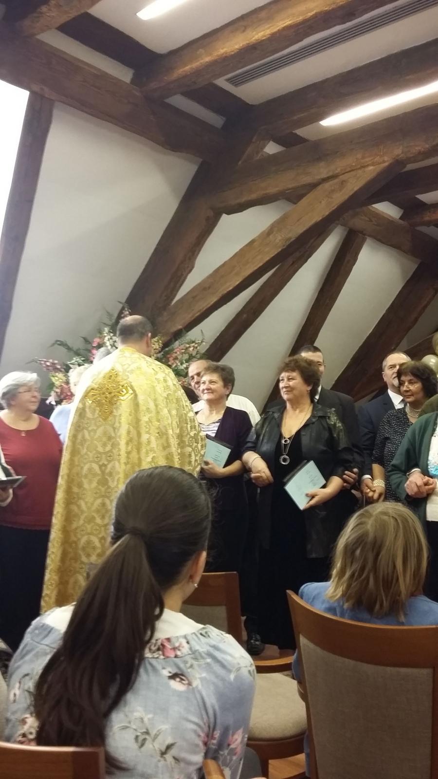 Ezúton is köszönjük, hogy mertek őszintén megnyílni, merték legbensőbb lelki élményeiket feltárni előttünk, minket is buzdítva arra, hogy nincs kilátástalan élethelyzet, merjünk Isten tenyerébe simulni. Az előadást követően a jubiláló házaspárok köszöntése és megáldása következett, örömünkre egyházközségünk egyik fiatal házaspárja is a jubilálók között sorakozott fel. A görögkatolikus szertartás szokatlan lehet mindazok számára, akik nem abban nevelkedtek, de talán megéreztek valamit szertartásaink gazdagságából, kifejező erejéből, természetfeletti felé íveléséből. A házaspárokra először közösen kértük Isten áldását, majd személyes, páronkénti áldásban részesültek.