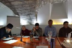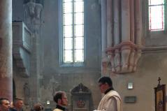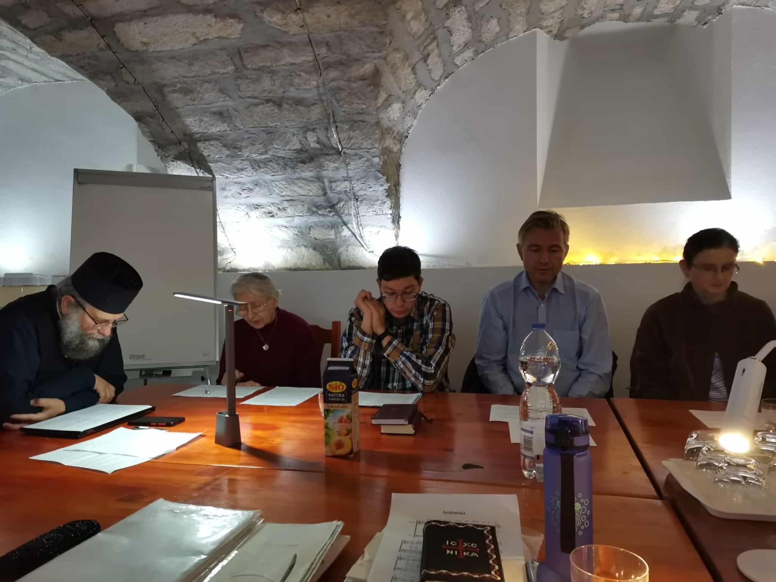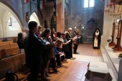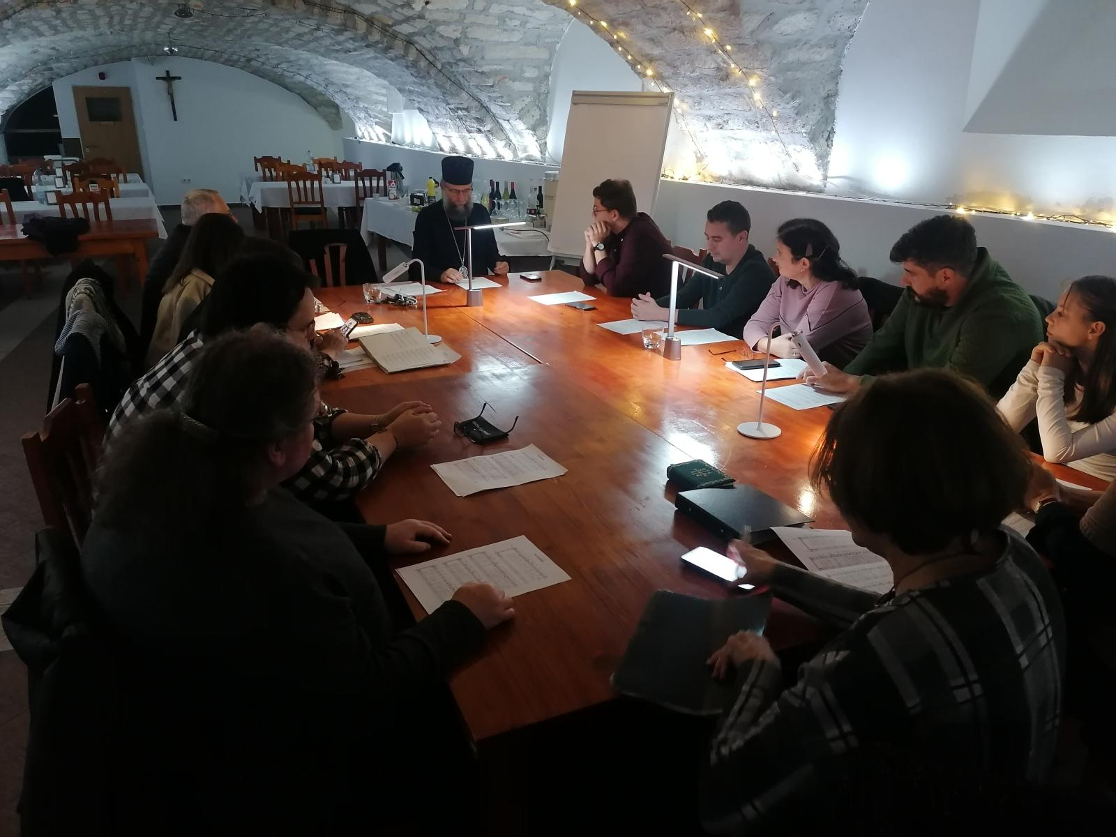 Szombaton délelőtt érsek atya tanítását kb. 25-en hallgatták. A kötetlen hangulatú gyakorlás során többek között az egyes ünnepek saját antifónáinak értelmezését, éneklését tanulmányoztuk, valamint a karácsonyi kánon dallamát. Igazi különlegesség volt pl. a bizánci dallamon énekelt "Valóban méltó" sztichira és egy ritkábban vett kerub ének.