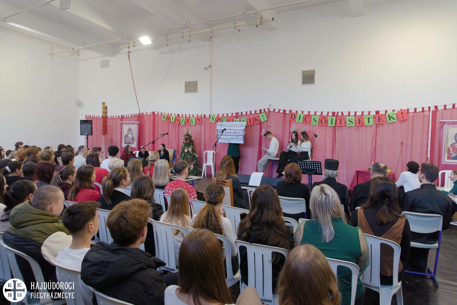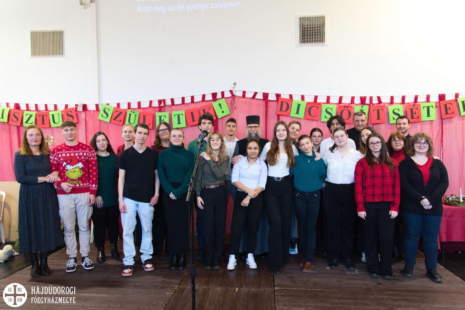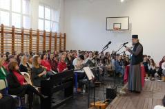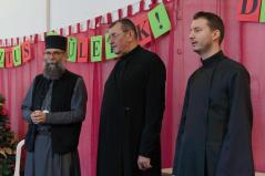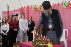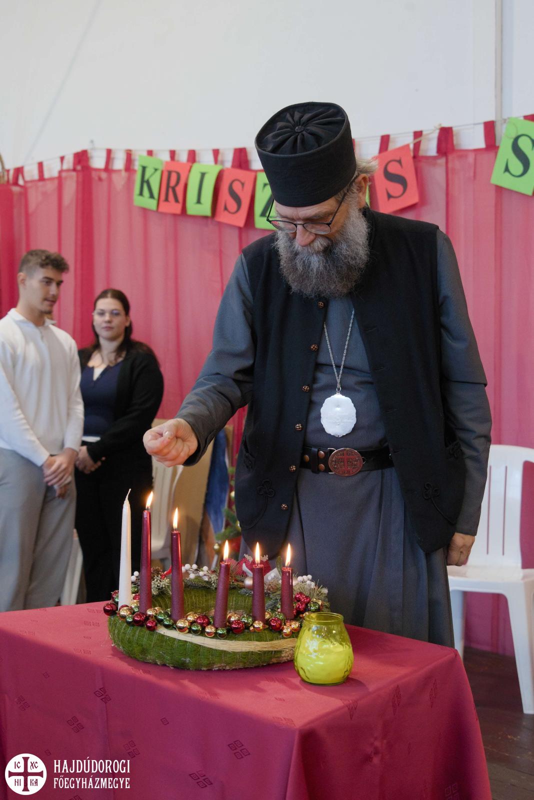 Az ünnepség kezdetén karácsonyi katavásziákat énekeltek a jelenlévő pedagógusok, tanulók Kocsis Fülöp metropolitával és az intézmény két egyházi szolgálattevőjével, Szilágyi Gábor és Papp András atyával közösen. Ezután Fülöp atya gyújtotta meg az utolsó gyertyát is az adventi koszorún.