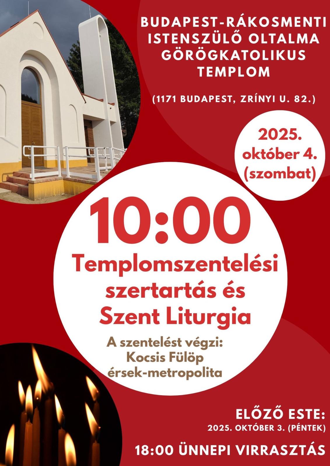 Az ünnepélyes tmplomszentelés 2025. október 4-én lesz, szombaton 10:00 órától. Előtte ünnepi virrasztást tartanak október 3-án 18:00 órától.
