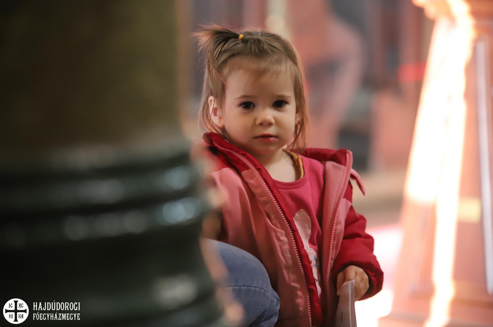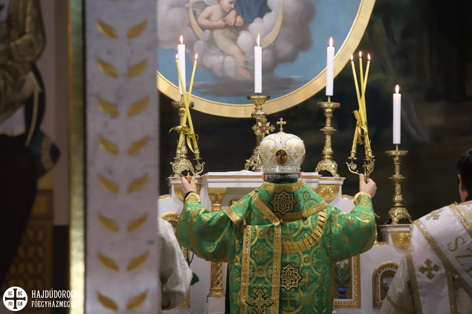 Figyeljük meg azt is, hogy a püspök jobb kezében egy háromágú gyertya van, amely a Szentháromságra utal, bal kezében pedig egy kétágú gyertya, amely Jézus Krisztus isteni és emberi természetét jelképezi. Akárcsak a görögkatolikus keresztvetésben – amelyet minden gyermek tud már –, hogy a három ujjunk összefogásával a Szentháromságot, az Atyát, a Fiút és a Szentlelket valljuk meg, a két behajlított ujjunk pedig Krisztus két természetére utal: ő Isten és ember.