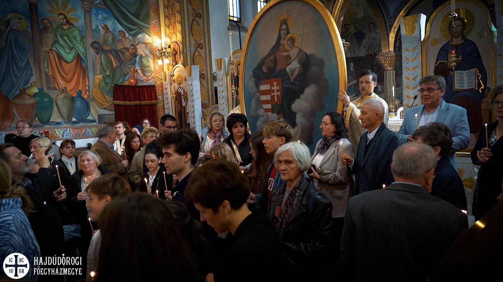 Már ekkor is csak meghatódva sikerült folytatnunk a Szent Liturgiát. Érzelmi viharok viszont igazán csak a végén töltötték el sokunk lelkét, amikor az oltárképet az ambonra a hívek közé hozva – most olyan közelről látva, ahogy sokan közülünk még soha – énekelhettük együtt: „A Szűz ma jelen van az Úr hajlékában”, „Siessünk buzgón az Istenszülőhöz” és pártfogását kérelmezve mindannyiunkra és az előttünk álló viszontagságokra a „Boldogasszony Anyánk” kezdetű himnuszunkat. Azt hiszem, a jelenlévők közül azon kevesek is, akiknek esetleg száraz maradt volna a szeme, átérezte ennek a pillanatnak a történelmi jelentőségét és nagyszerűségét.