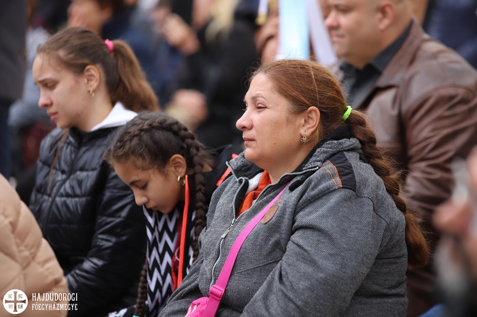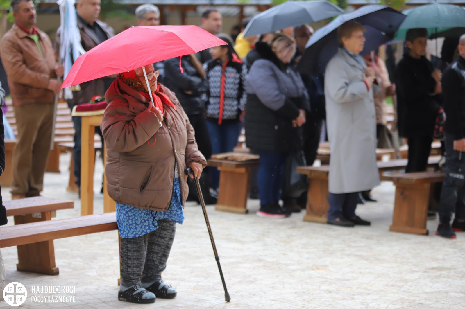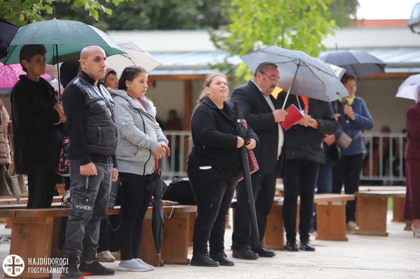 A magyar és cerhári nyelven végzett Szent Liturgián a hodászi cigány egyházközség teljesített kántori szolgálatot Sója Miklós bácsi tanítványa, Lakatos Sándor vezetésével. A nagybemenet alatt már sötét fellegek gyülekeztek Máriapócs fölött, hamarosan el is kezdett esni. Előkerültek az ernyők, sokan az árkádok alatt kerestek menedéket, a már említett úr is elővette az esernyőjét, de mire fejünk fölé emelte, már el is állt az eső.