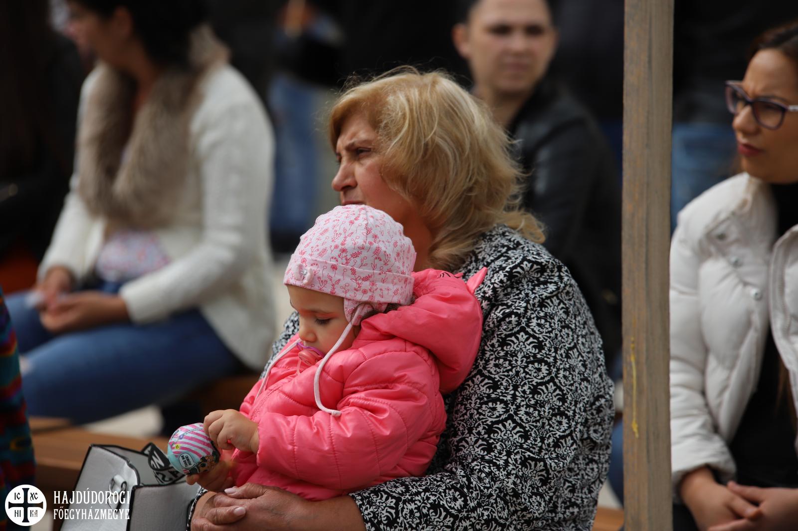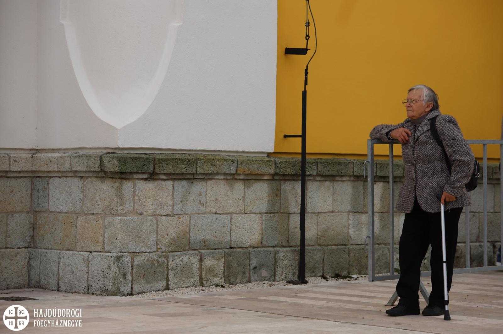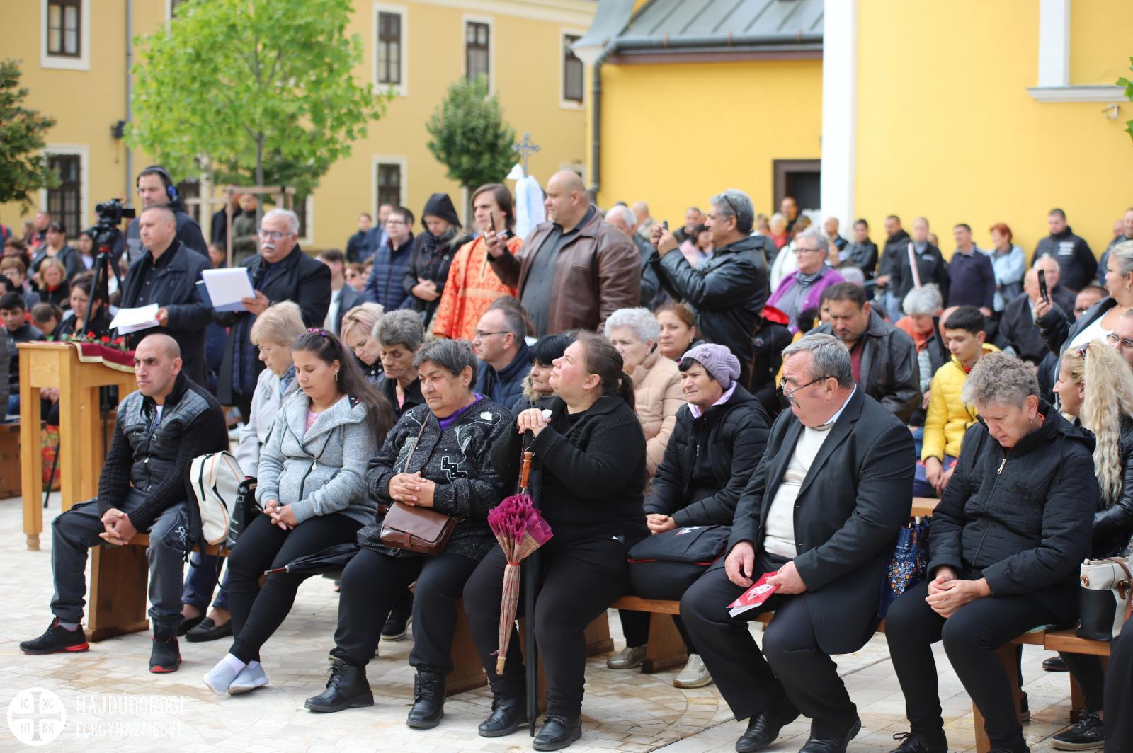 A magyar és cerhári nyelven végzett Szent Liturgián a hodászi cigány egyházközség teljesített kántori szolgálatot Sója Miklós bácsi tanítványa, Lakatos Sándor vezetésével. A nagybemenet alatt már sötét fellegek gyülekeztek Máriapócs fölött, hamarosan el is kezdett esni. Előkerültek az ernyők, sokan az árkádok alatt kerestek menedéket, a már említett úr is elővette az esernyőjét, de mire fejünk fölé emelte, már el is állt az eső.