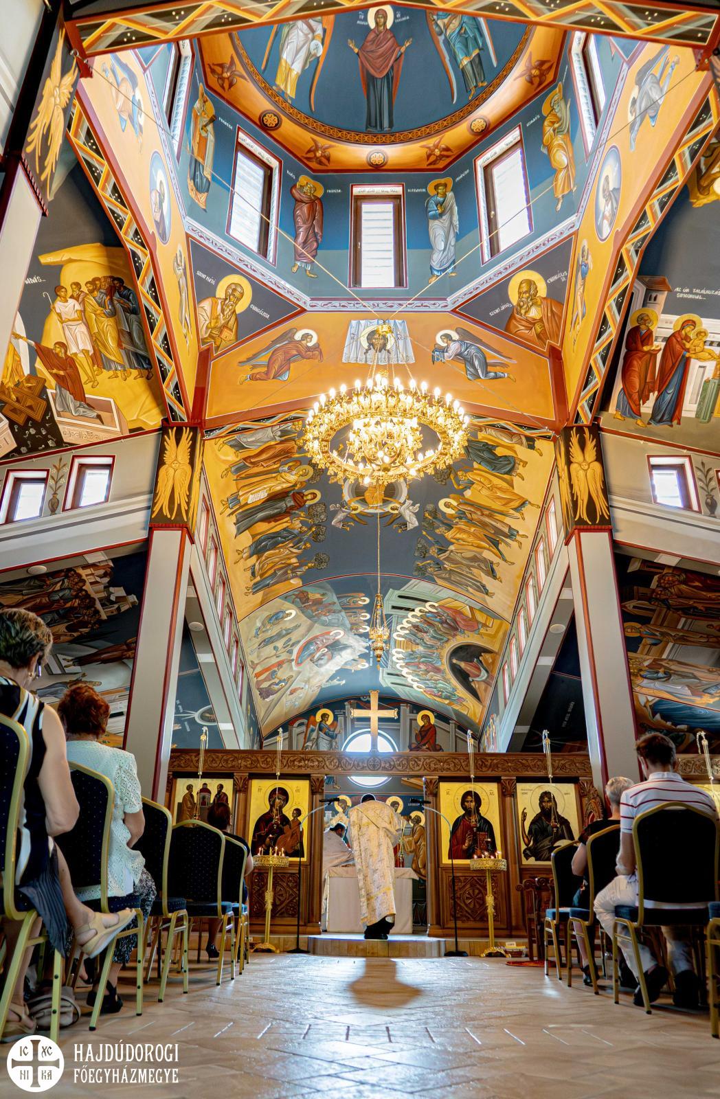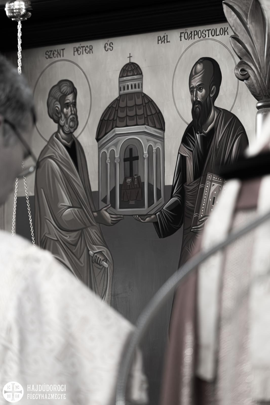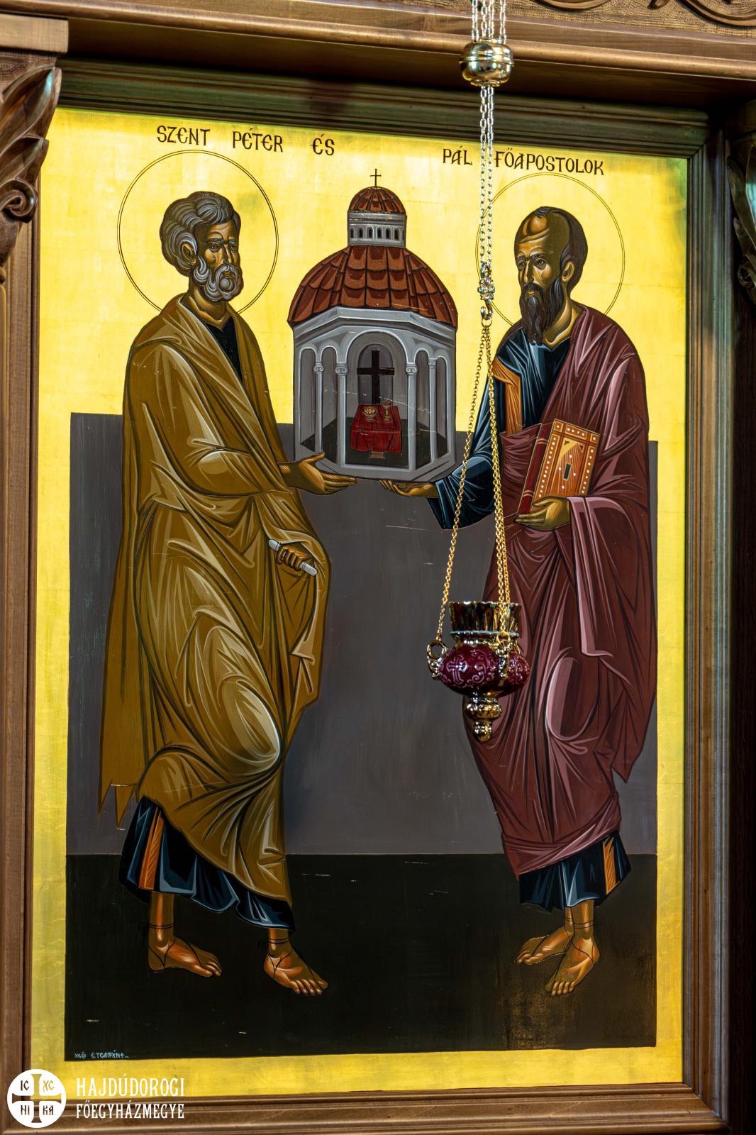 Már kora reggeltől fohász hallatszott ki az utcára, hiszen utrenyével indult a nap június 29-én, vasárnap reggel a Szent Péter és Pál főapostolokról elnevezett dunakeszi templomban. Fülöp metropolita jelenlétében hármas ünnepen vehettek részt a helyiek és persze a vendégek. Egyrészt az ott élők lelkesen készültek a templombúcsúra, másrészt végeztek a görög szakemberek a belső festéssel és elkészült az ikonosztázion is. Ezeket a metropolita áldotta meg Varga Lajos váci segédpüspökkel karöltve.