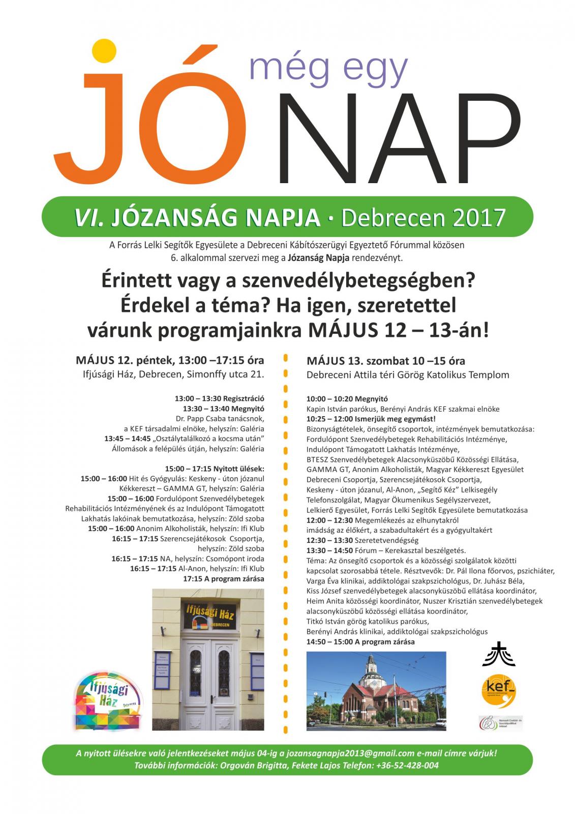 A Józanság napját a Forrás Lelki Segítők Egyesülete rendezi meg a Debreceni Kábítószerügyi Egyeztető Fórummal közösen, melyre szeretettel várnak minden érdeklődőt. Május 12-13-án két helyszín is lesz: pénteken a Simonffy utcai Ifjúsági Házban, szombaton az Attila téri görögkatolikus főszékesegyházban lesznek programok: előadások, csoportos beszélgetések, tanúságtétel. Részletek a plakáton.