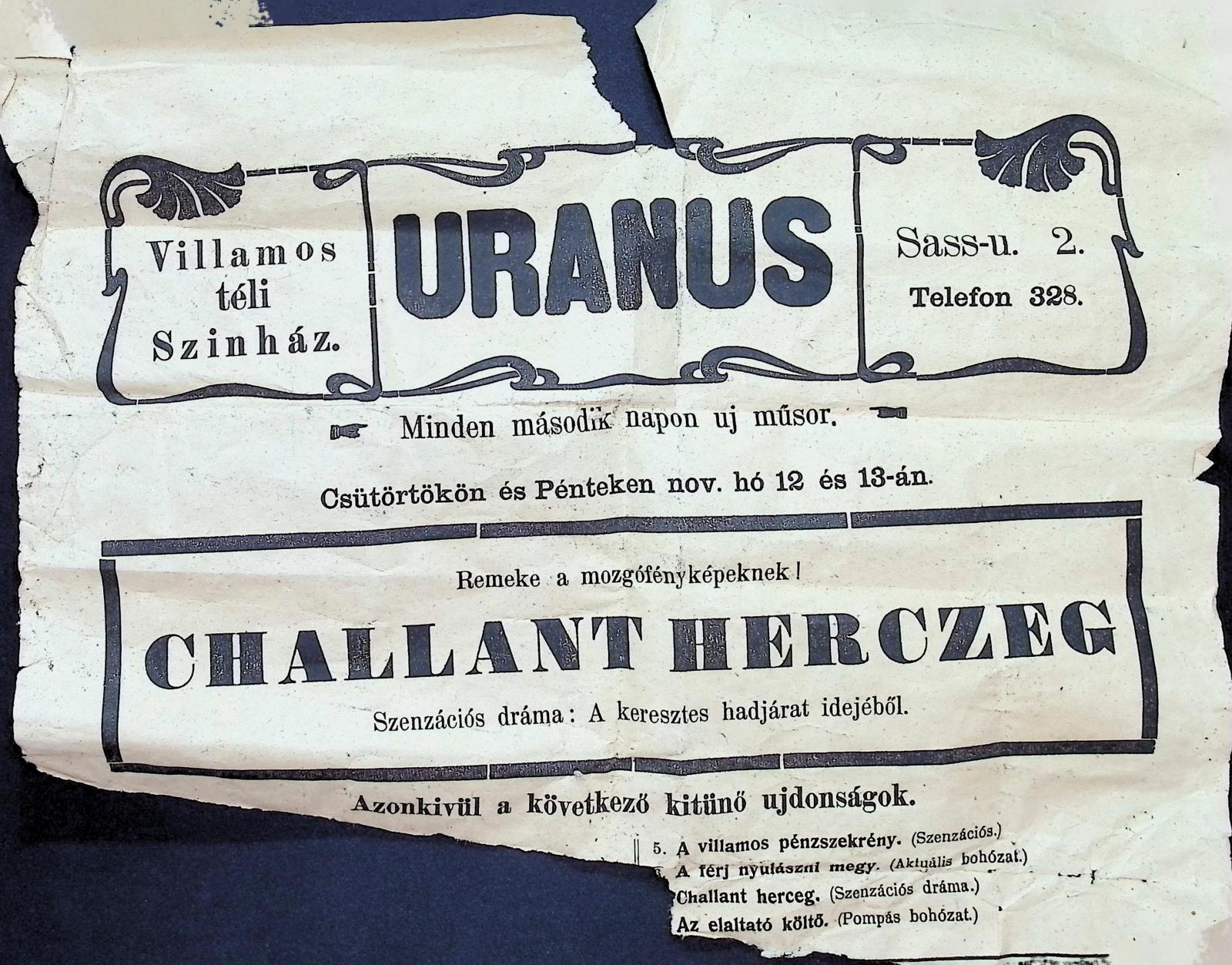 Igazán különleges az iratra mintegy védőrétegként elhelyezett, kissé szakadt papír is, amely az Uranus mozgóképszínház műsoráról tudósít minket.