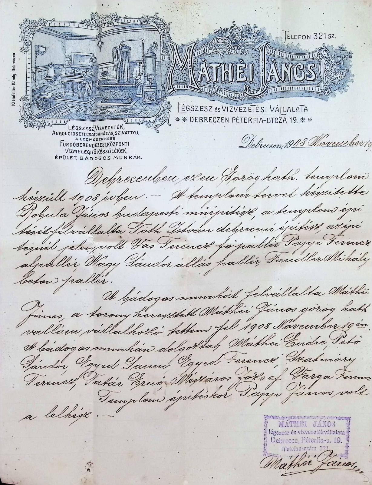 Az iratban Máthéi János, a bádogos munkát felvállaló vállalkozó tájékoztatja az utókort e fontos adatokról, s teszi mindezt egy olyan gazdagon díszített papíron, amelyet csak ritkán tarthat kezében az ember.