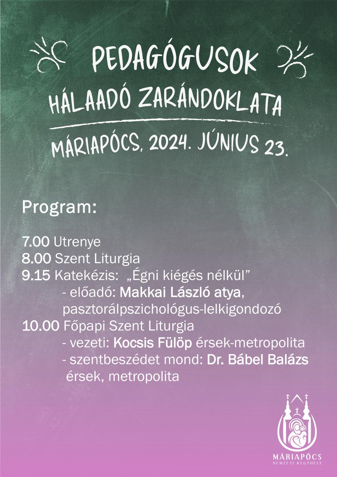 Évek óta hagyomány egyházunkban, hogy a tanítási év befejezése után a pedagógusok Máriapócson gyűlnek össze, hogy hálát adjanak a tanévben kapott kegyelmekért. Ebben az évben június 23-án, vasárnap várják az érdeklődőket. A Szent Liturgiát Kocsis Fülöp metropolita vezeti, a vendégünk pedig dr. Bábel Balázs érsek lesz.
