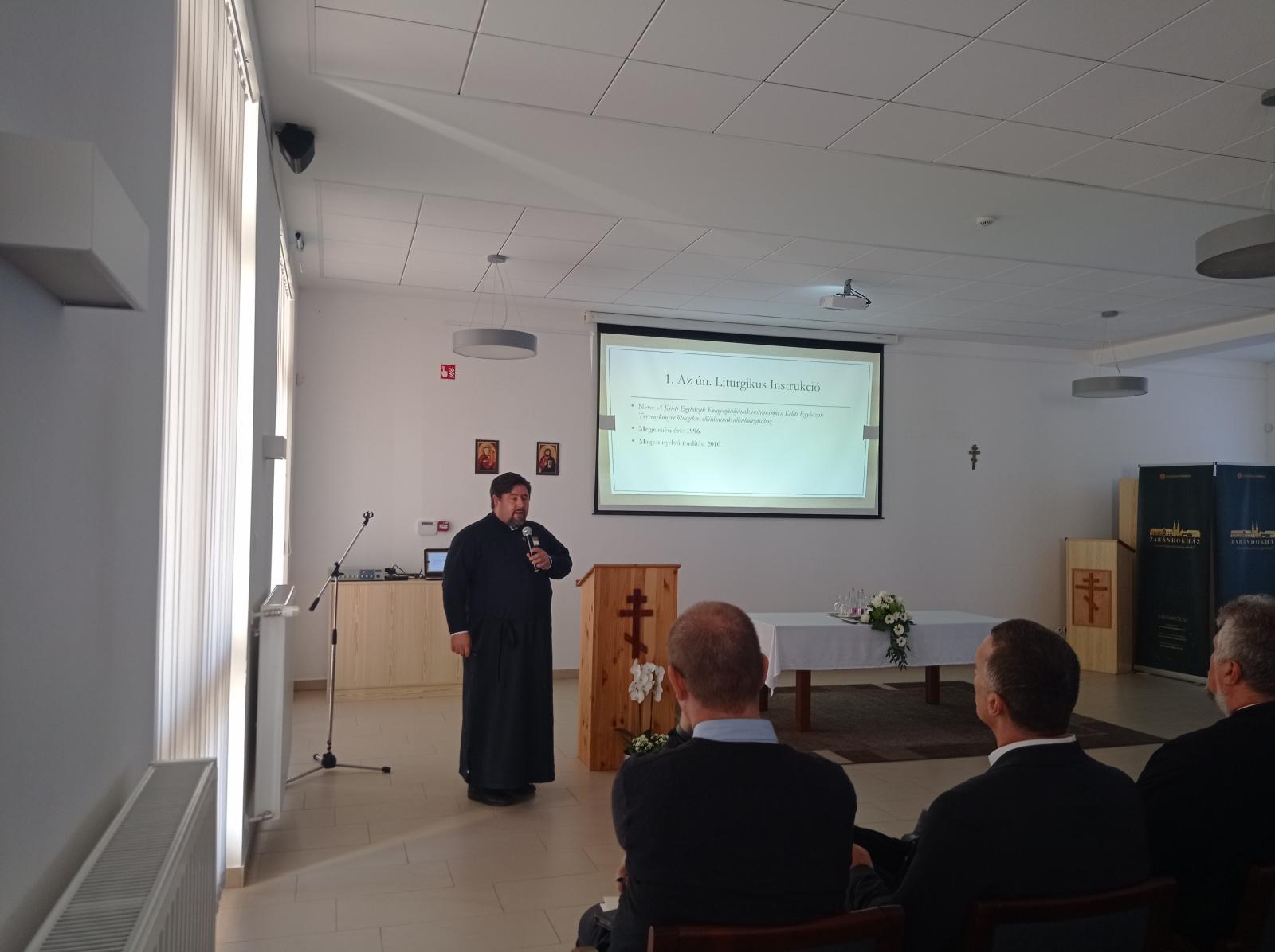 A második előadásban Nyirán János számolt be a metropólia liturgikus életéről. Bemutatta a szentszéki rendelkezést, az úgynevezett „Liturgikus Instrukciót", kiemelve azokat a pontokat, amelyek a mi egyházunknak is sajátos feladatokat adnak. Ebben az előadásban is voltak meglepetések a hallgatók számára. Hiszen, nem mindenki tudott arról, hogy az egyházunkban érzékelhető liturgikus változások valójában a szentszéki előírásokat követik.