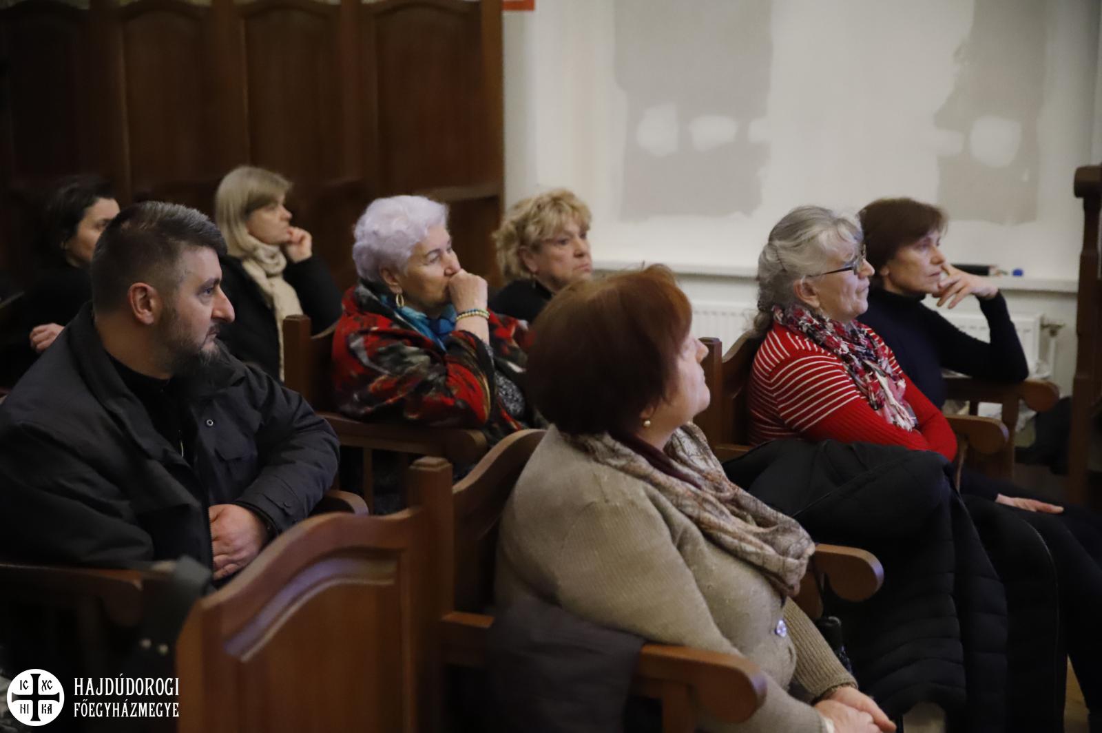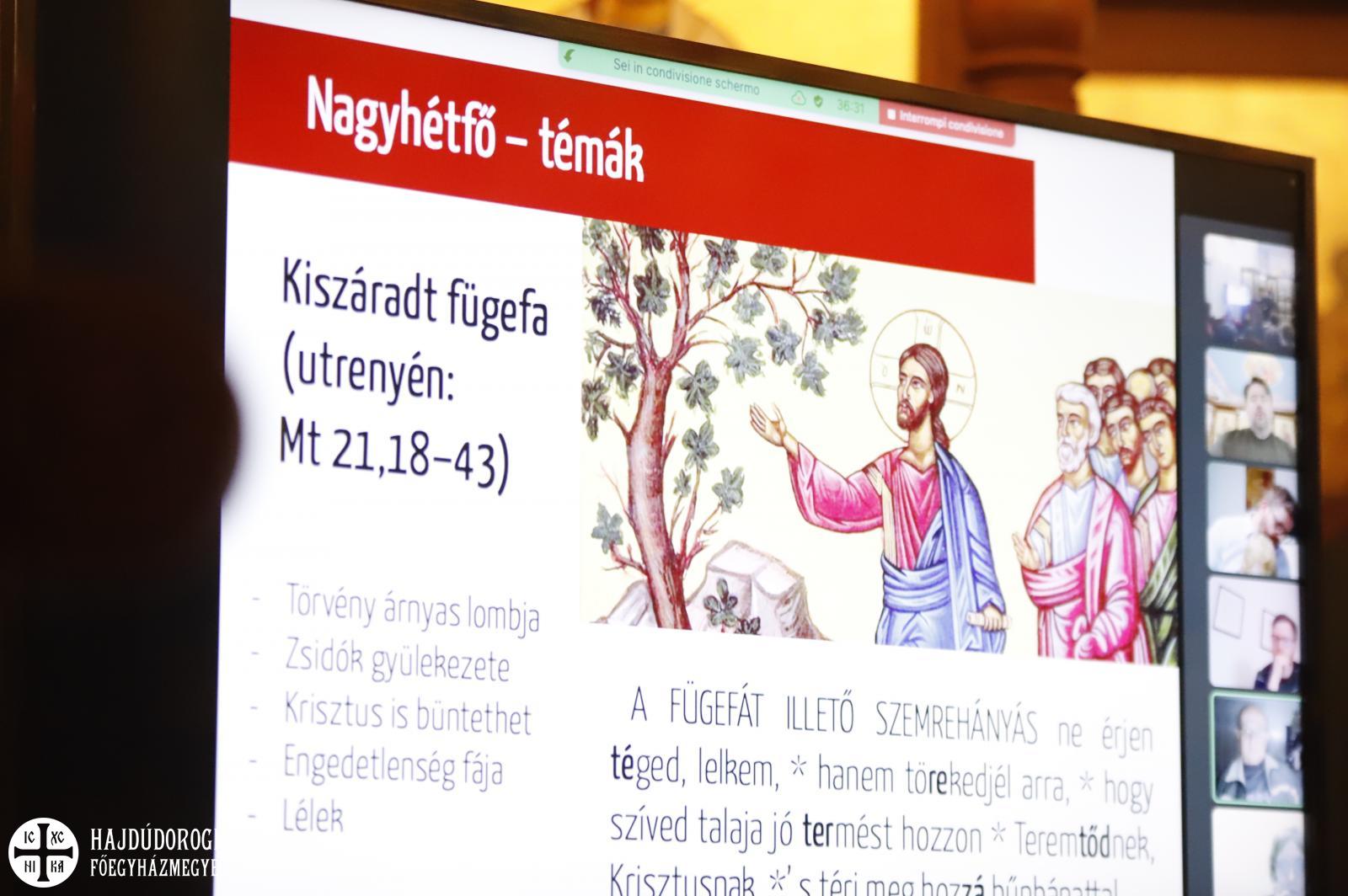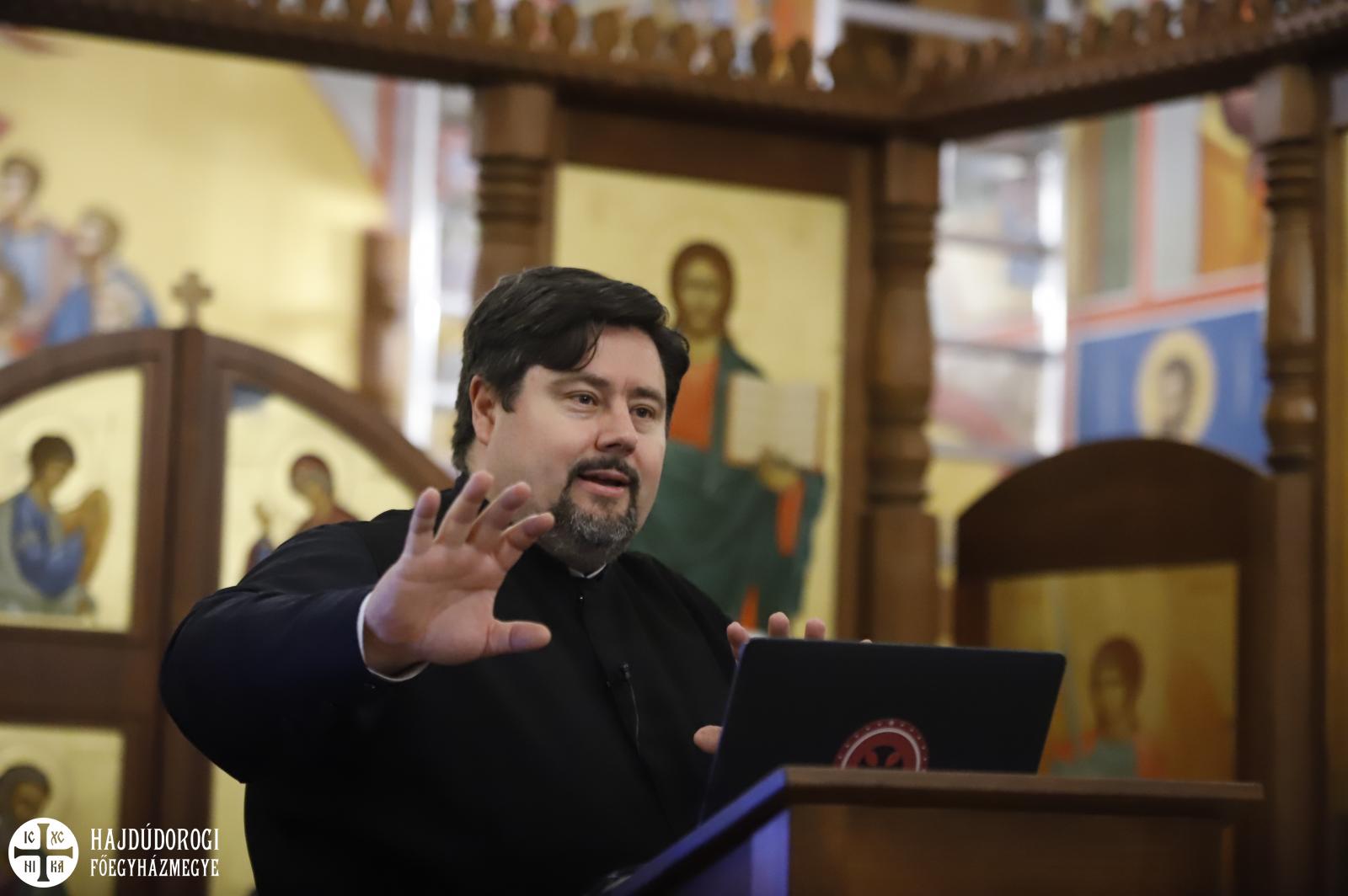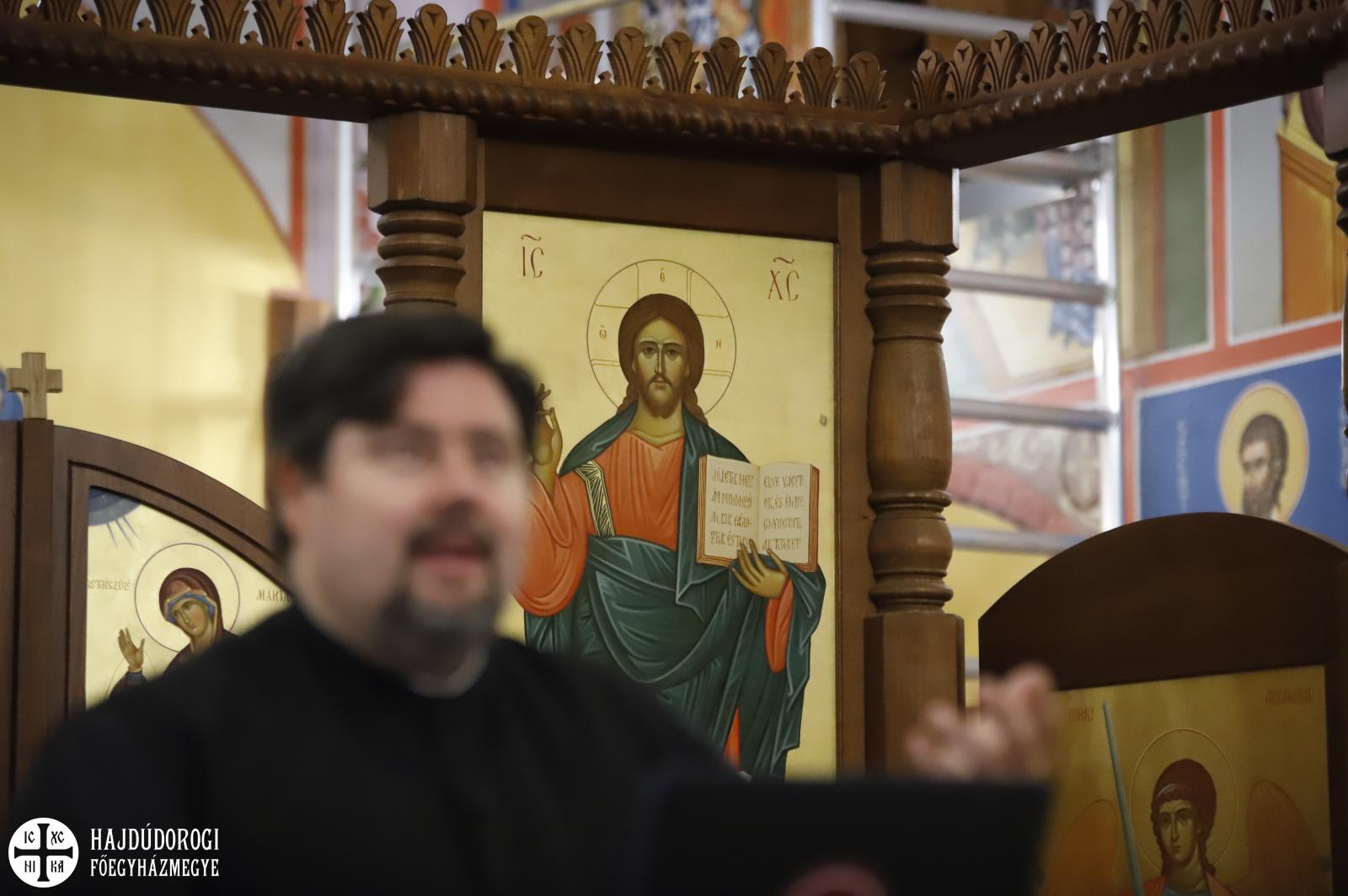 E „vezérfonalon” haladva további képeken, ikonokon és liturgikus szövegeken keresztül vezette be a hallgatóságot János atya a nagyheti szertartások részleteibe. – Tisztahétfőtől Lázár-szombatig jön ki a negyvennapos böjt, Lázár-szombat és virágvasárnap egyfajta szünnapok, amin „megpihenhetünk” a Nagyhét különleges szertartásai előtt, hogy aztán minden húsvét ünnepén csúcsosodjon ki – mutatott rá János atya.