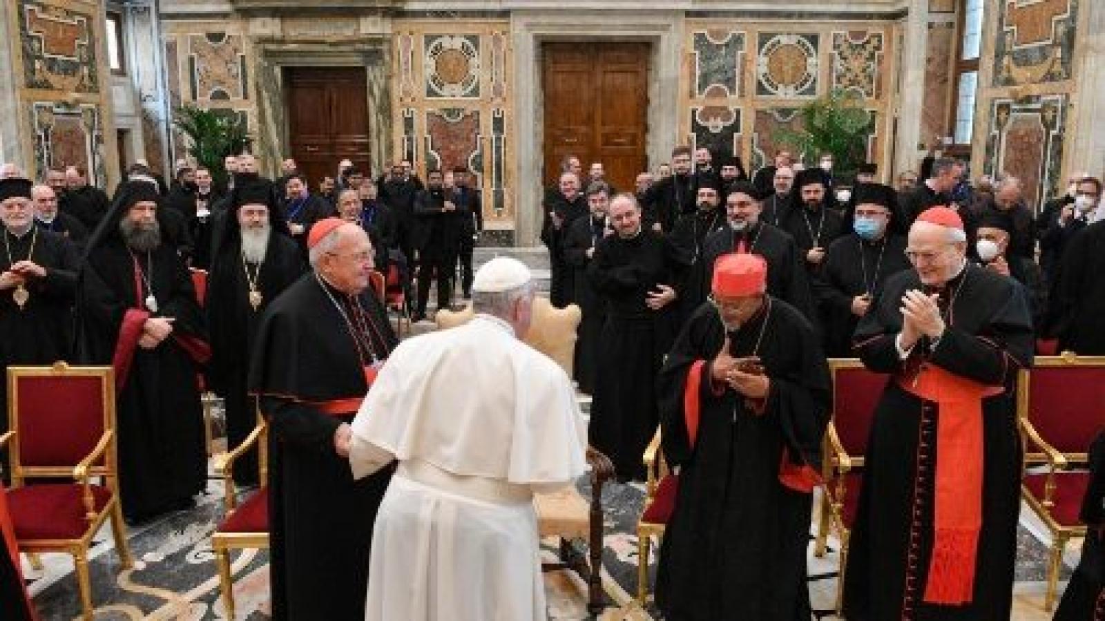 A száz éve elhunyt XV. Benedek pápa alapította a Keleti Egyházak Kongregációját, illetve a Pápai Keleti Intézetet. Ő volt az, aki az első világháborút fölösleges vérontásnak nevezte. Felhívásai azonban nem találtak meghallgatásra a nemzetek vezetői között, mint ahogy Szent II. János Pál szavait is figyelmen kívül hagyták az iraki háború esetében – kezdte beszédét Ferenc pápa, majd kemény szavakkal így folytatta: Ma, amikor mindenütt háborúk folynak, ugyanígy nem hallják meg a pápák és a jóakaratú emberek hangját.
