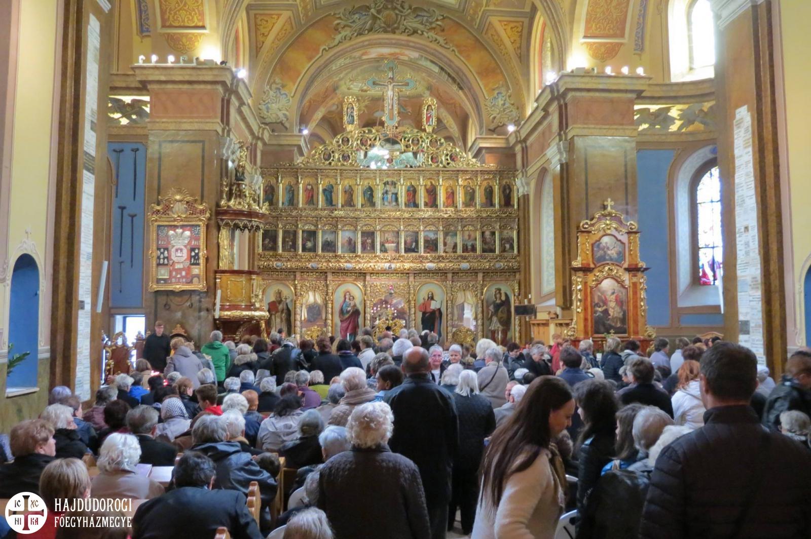 A rossz idő ellenére 19 busszal érkeztek magyar görögkatolikusok Szlovákiából, hogy közösen imádkozhassunk Máriapócson. Kilenc órától gyóntatás kezdődött, a Szent Liturgiát Juhász Géza, a Miskolci Egyházmegyehelynöke végezte, a prédikációt pedig Mosolygó Tibor atyától hallhattuk. A kegytemplom zsúfolásig telt hívőkkel. Sokan már csak a templomon kívül, az udvarban helyezkedhettek el, a gyóntató folyosón. Innen követték az imádságot.