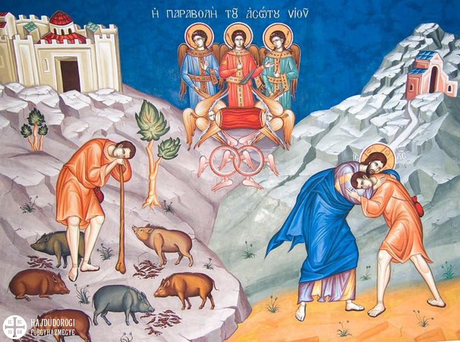 Mondta az Úr ezt a példabeszédet: „Egy embernek volt két fia. A fiatalabb így szólt apjához: »Atyám, add ki nekem az örökség rám eső részét!« Erre szétosztotta köztük vagyonát. Nem sokkal ezután a fiatalabb fiú összeszedte mindenét, elment egy távoli országba, és ott kicsapongó életet élve eltékozolta vagyonát. Miután mindenét elpazarolta, nagy éhínség támadt azon a vidéken, és nélkülözni kezdett. Erre elment, és elszegődött egy ottani gazdához. Az kiküldte őt a tanyájára disznókat legeltetni. Szeretett volna jóllakni abból a vadgyümölcsből, amit a disznók ettek, de senki sem adott neki. Ekkor magába szállt, és ezt mondta: »Atyámnak hány bérese bővelkedik kenyérben, én meg éhen halok. Fölkelek, elmegyek atyámhoz, és azt mondom neki: Atyám, vétkeztem az ég ellen és teellened. Már nem vagyok méltó arra, hogy fiadnak neveztessem, csak béreseid közé fogadj be engem!« Csakugyan felkelt, és visszatért apjához. Apja már messziről meglátta, és megesett rajta a szíve. Eléje futott, a nyakába borult, és megcsókolta. Erre a fiú ezt mondta neki: »Atyám, vétkeztem az ég ellen és teellened. Már nem vagyok méltó arra, hogy fiadnak nevezz.« Az apa azonban odaszólt a szolgáknak: »Hozzátok elő a legelső ruhát, és adjátok rá! Húzzatok gyűrűt az ujjára, és sarut a lábára! Hozzátok elő a hizlalt borjút, és vágjátok le! Együnk és vigadjunk, mert ez a fiam halott volt, és életre kelt, elveszett, és megkerült!« Erre vigadozni kezdtek. Az idősebb fia pedig kint volt a mezőn. Amikor hazatérőben közeledett a házhoz, meghallotta a zeneszót és a táncot. Odahívott egyet a szolgák közül, és megkérdezte, hogy mi történt. Ő pedig ezt mondta neki: »Megjött az öcséd, és apád levágatta a hizlalt borjút, mivel egészségben kapta őt vissza.« Erre megharagudott, és nem akart bemenni. Ezért az apja kijött, és kérlelte. Ő azonban feleletül ezt mondta az apának: »Íme, hány éve szolgálok neked, és sohasem szegtem meg parancsodat, nekem mégsem adtál soha egy kecskét sem, hogy mulathassak a barátaimmal. De amikor megjött ez a te fiad, aki vagyonodat paráznákra pazarolta, levágattad neki a hizlalt borjút.« Ő azonban ezt mondta neki: »Fiam, te mindig velem vagy, és mindenem a tied. De vigadozni és örvendezni kellett, mert ez az öcséd halott volt, és életre kelt, elveszett, és megkerült.«”