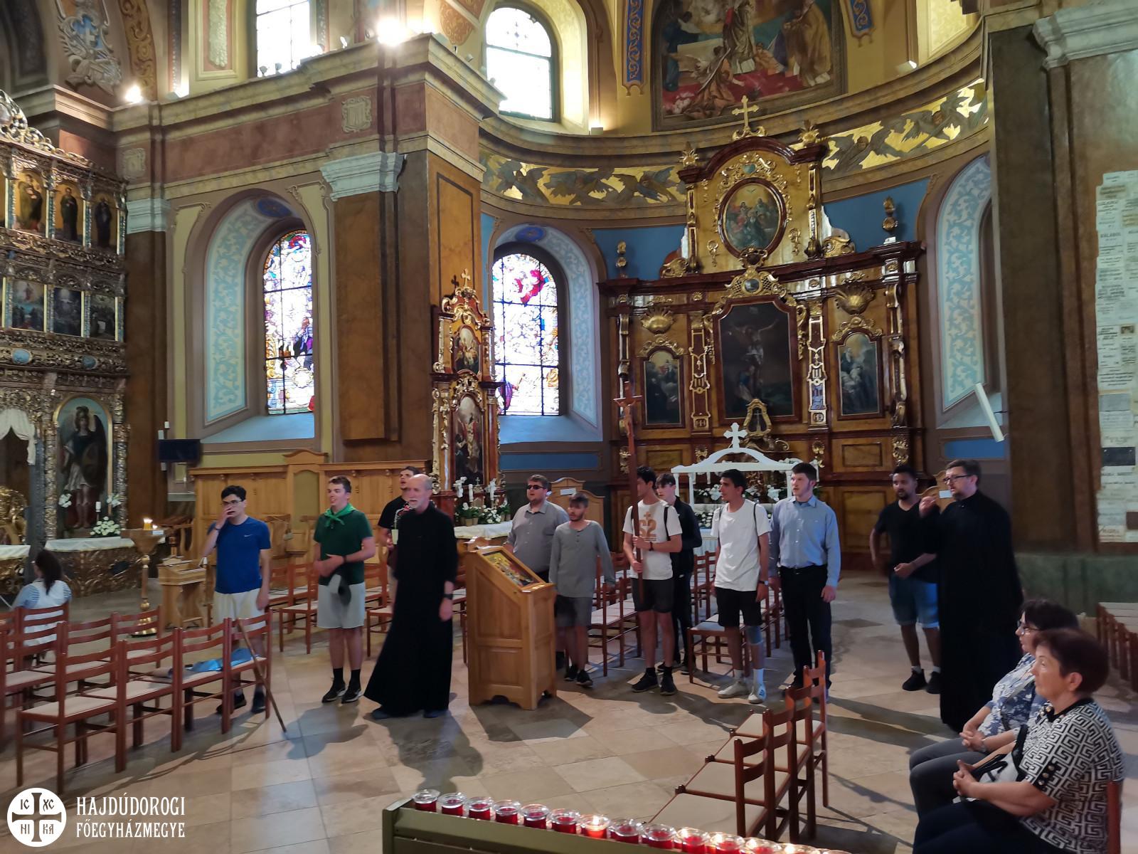 A következő szállás a tiszalöki általános iskolában, a tornateremben volt, hála Cserés Csaba igazgató úrnak, aki a közeli idősek otthonában vacsorát és reggelit is intézett a fiúk számára. Az utolsó este Nyíregyházán szintén remekül sikerült, Polgári Bence prefektus atya a szállást biztosította, Kondás Sándor atya és felesége grillpartira várta a megfáradt csapatot. A vecsernyén találkoztak Ábel püspök atyával, aki csatlakozott a vacsora idejére, s ami még többet jelentett a zarándokoknak: vasárnap a Nyíregyháza-Napkor szakaszra. A Szent Liturgiát is együtt ünnepelték. A fiúkat az édesanyák köszöntésébe is bevonta Mosolygó Tamás parókus atya, Kémenes Örs szavalt, az Istenszülő dicséretére pedig közösen énekeltek. Utána Valika tisztelendő asszony és az egyházközség vendégszeretetének köszönhetően bőséges reggelivel ellátva folytathatták útjukat a fiatalok.
