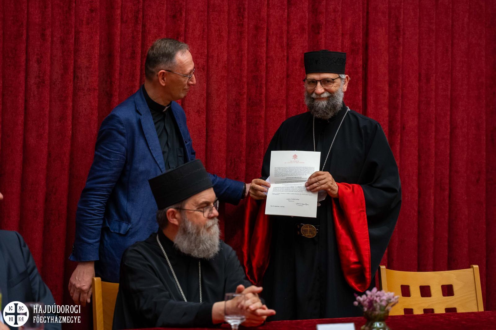 Az aggregáció folyamatáról és sikeres lezárulásáról a római anyaintézményünket, a Pápai Gregoriana Egyetemhez tartozó Pápai Keleti Intézetet képviselő Rafał atya beszélt részletesebben, aki ezután az ezt igazoló díszoklevelet is átadta Kocsis Fülöp metropolitának. A főiskola jövőjének szempontjából fontos tény, hogy az aggregáció folyamata pozitív eredménnyel zárult, s legalább ilyen fontos a jövőt tekintve a magyarországi felsőoktatási intézményekkel való együttműködés is. Erről az együttműködésről dr. Gloviczki Zoltán, az Apor Vilmos Katolikus Főiskola rektora osztotta meg velünk gondolatait. A két intézmény szeptemberben egy közös szakirányú pedagógus továbbképzést indít organikus pedagógia címmel. E képzésen nemcsak pedagógiai ismeretek és eszközök, hanem az érzelmi intelligenciát fejlesztő, az emberi élet teljességét átfogó tudás szerezhető – emelte ki a képzés jelentőségét a rektor.