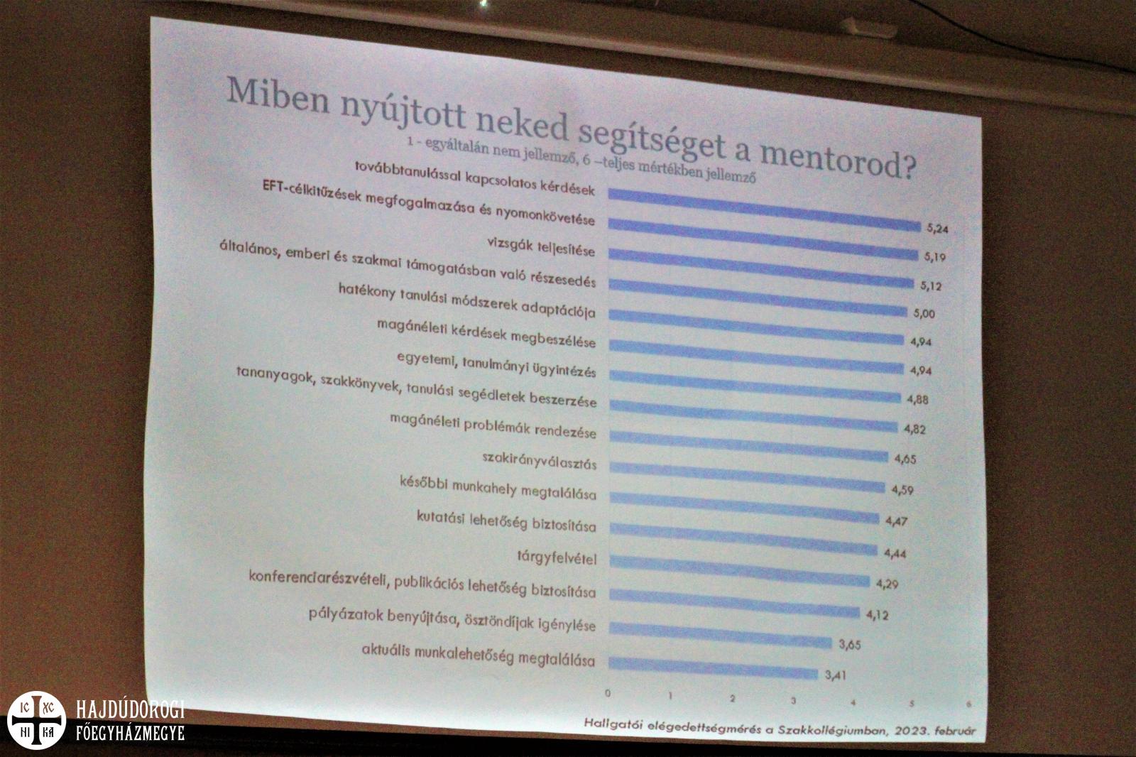 A tanévzáró Szilágyi Eszter tanulmányi vezető előadásával folytatódott, aki az újragondolt mentorrendszerről számolt be. 24 mentor – köztük dékánhelyettesek, adjunktusok, docensek – havi kétórányi konzultáció keretében segítik a szakkollégistákat az eredményes tanulmányi előrehaladásban.