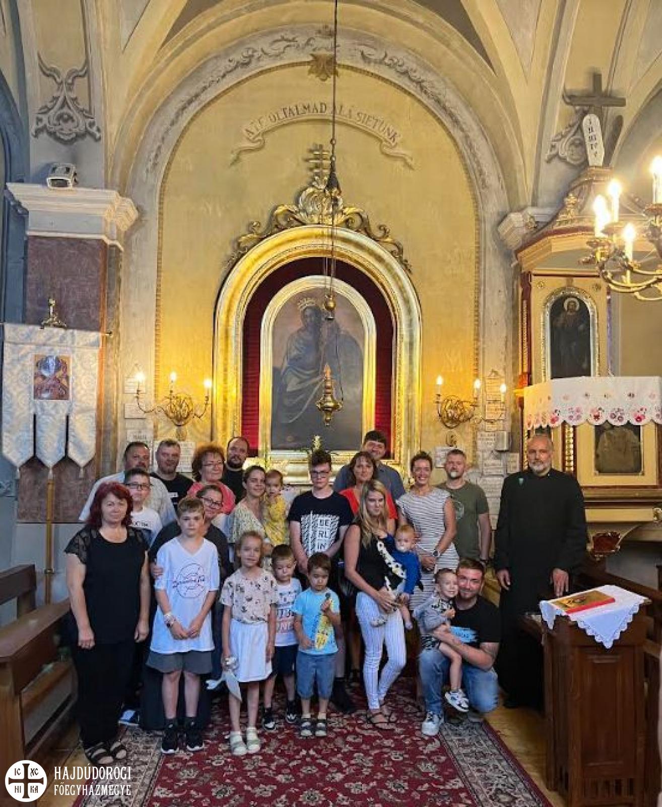Később Miskolcot magunk mögött hagyva indultunk tovább Sajópálfalára, ahol Kiss Attila parókus atya fogadott minket, s mutatta be személyes lelki élményeit is megemlítve a kegytemplomot és a kegyképet. A templomi csendes imádság után egy előadás erejéig a nyári lelkigyakorlatba kapcsolódtunk be és hallgattuk meg Tyukodi Attila atya irgalmasságról szóló tanítását, majd a lelkigyakorlaton lévőkkel közösen énekeltük el az Akathisztosz himnuszt a kegytemplomban. Csodálatos élmény volt!