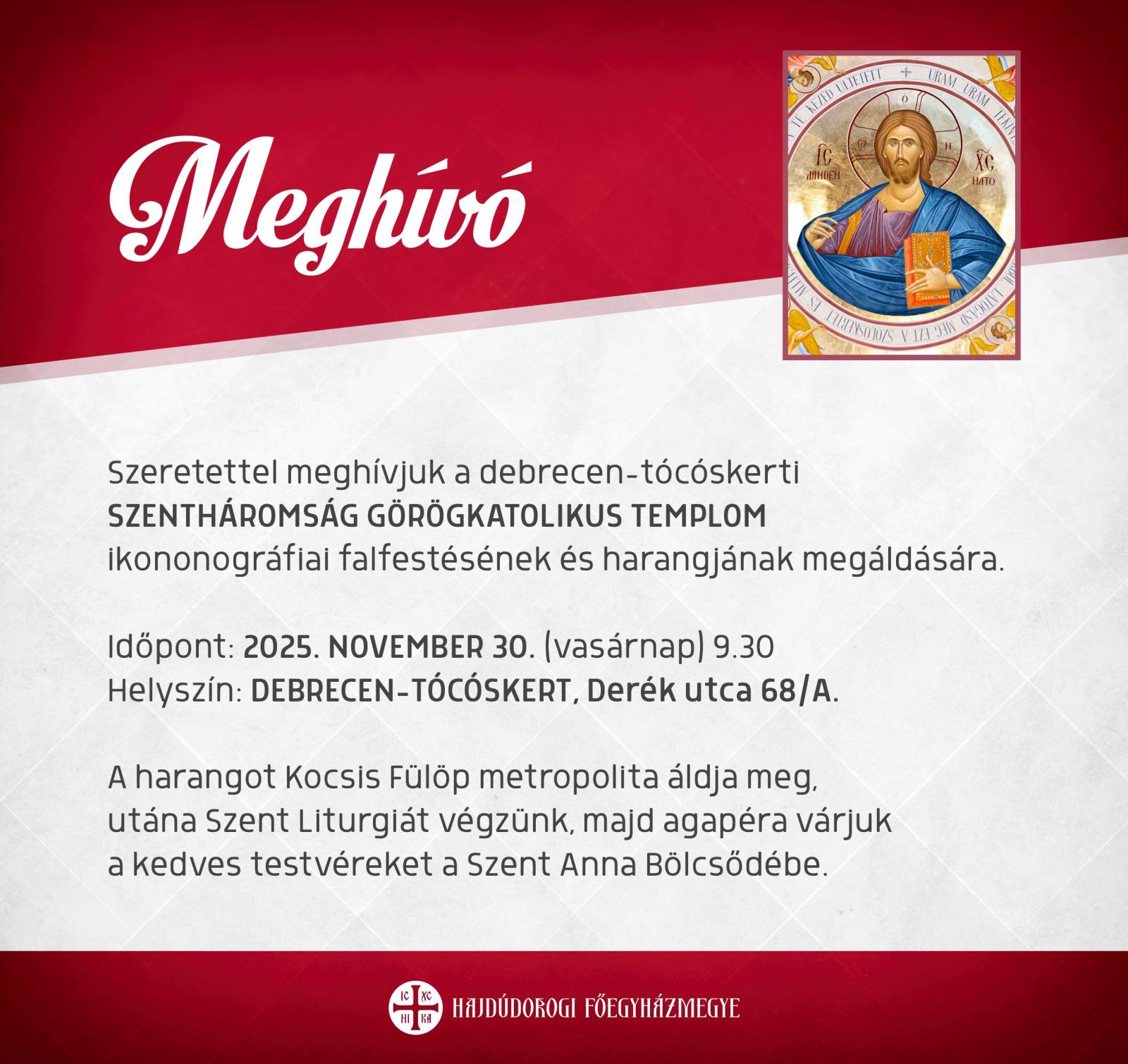 A Hajdúdorogi Főegyházmegye, valamint a hívek nagylelkű támogatásának köszönhetően elkészült a tócóskerti templom belső művészi festése, a közösség egy 180 kg-os haranggal is gazdagodott. Szeretettel hívjuk a kedves testvéreket a Debrecen-Tócóskerti Görögkatolikus Egyházközség ünnepi alkalmára, ahol először csendül fel az új harang hívó szava, és közösen adunk hálát templomunk megújulásáért.