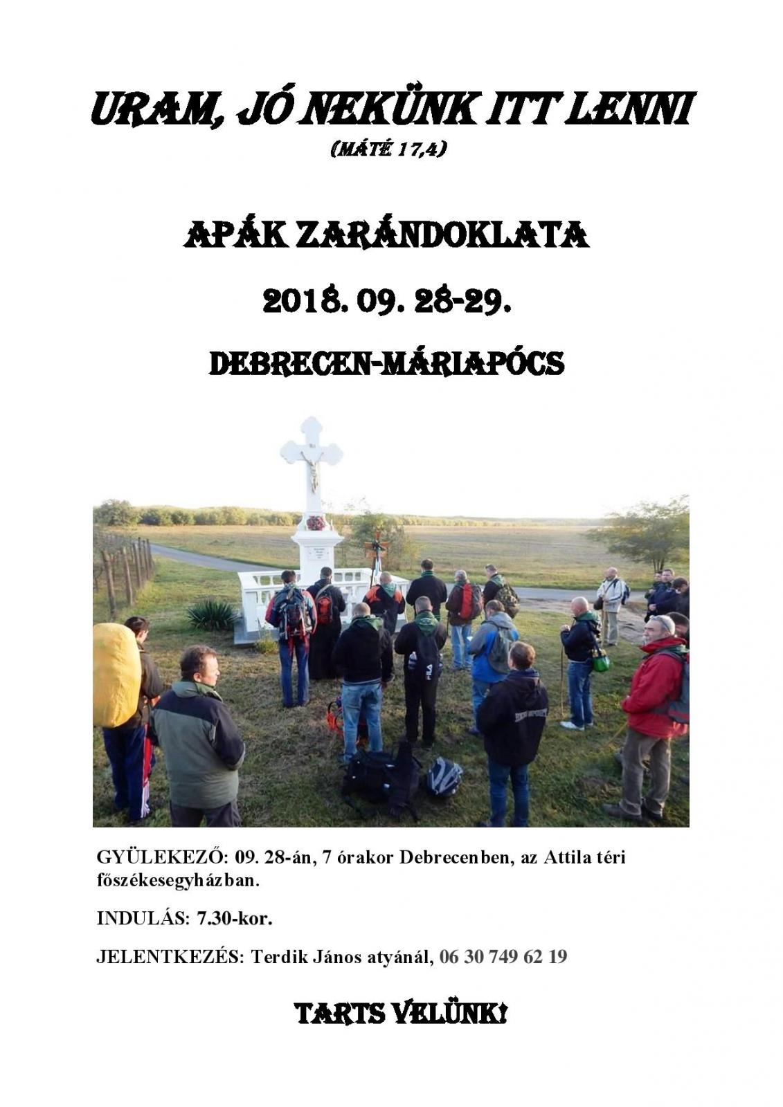 Első nap Nyíradonyig megy a menet, ahol megszállnak. Másnap folytatják útjukat az édesapák, a Nemzeti Kegyhelyre. A családfők szeretteikért indulnak útra, akik vasárnap, a Családok és Házaspárok búcsúján csatlakozhatnak a zarándok apákhoz, hogy közösen adjanak hálát. Ennek érdekében, megfelelő létszám esetén szeptember 30-án busz indul Debrecenből.