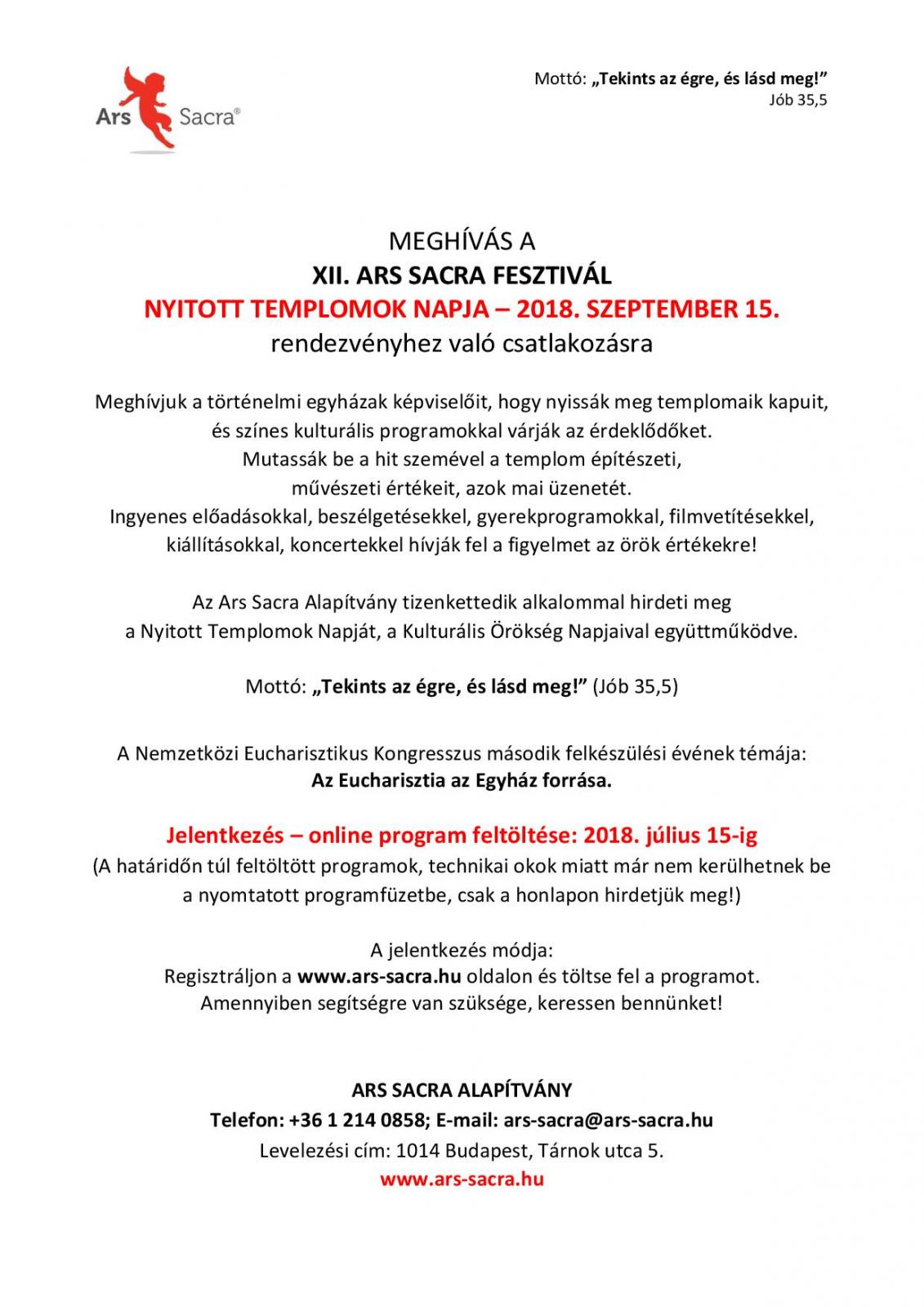 2018-ban újra megrendezik az Ars Sacra Fesztivált, melynek keretében szeptember 15-én, a fesztivál nyitónapján a templomok kapui megnyílnak és színes programokkal várják az érdeklődőket. A több mint egy hétig tartó rendezvényhez csatlakoznak múzeumok, kiállítóhelyek, galériák, színházak, kulturális központok, egyházművészeti gyűjtemények azzal a céllal, hogy a különböző művészeti ágakon belül felszínre hozzák és népszerűsítsék a szakralitást, felmutassák a zsidó-keresztény kultúrában rejlő remény jeleit, rávilágítsanak a Szépre, Jóra, Igazra a művészet minden ágának bevonásával. Az idei mottó: "Tekints az égre, és lásd meg!" (Jób 35,5)