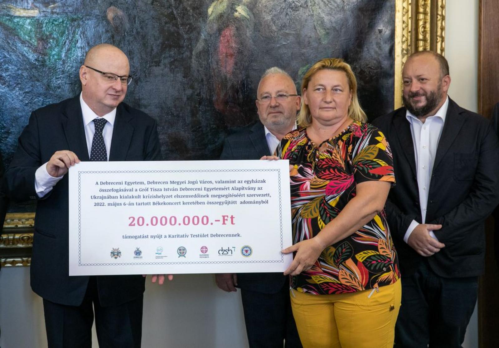 Mint mondta, a legfontosabb fegyvertény az, hogy segítsünk embertársainkon, és nagyon nagy dolog volt a koncert, ami igen rövid idő alatt valósult meg, de bebizonyította, hogy így is komoly eredményt lehet elérni. Kiemelte: már a koncert előtt 25 millió forint gyűlt össze, majd utána is érkeztek adományok, így 36 millió 331 ezer forintot tudnak most átadni. Megjegyezte: a DE 6 millió forintot adott a lebonyolítás költségeire. Beszámolt arról, hogy a történelmi egyházak, a város, az egyetem képviselőinek tanácsa javaslatot tett a kuratóriumnak az összeg elosztására.