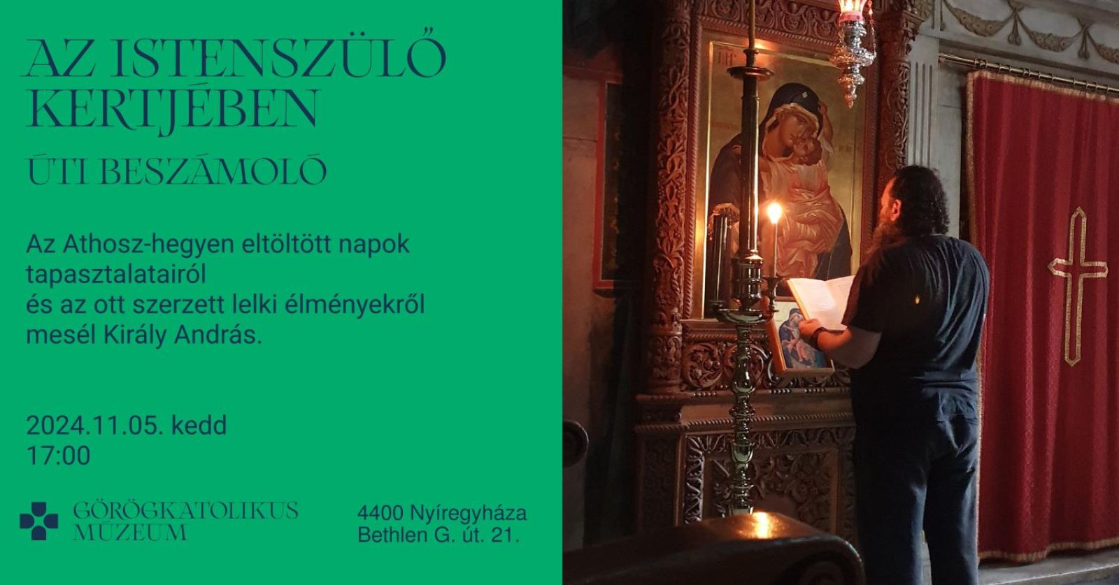 November 5-én, kedden 17 órától „Az Istenszülő kertjében” címmel úti beszámolót hallgathatunk meg a Görögkatolikus Múzeumban. Király András vetítéssel egybekötött előadására kerül sor az Athosz hegyen eltöltött napjainak tapasztalatairól, és az ott szerzett lelki élményeiről.